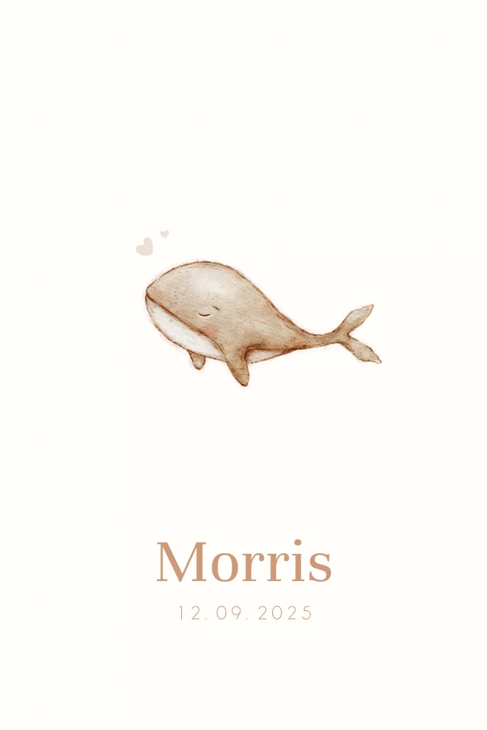 Dit is een mooi geboortekaartje voor je zoontje. Op het kaartje staat de watercolour illustratie van een walvis. Het kaartje kan naar wens aangepast worden in onze online editor. Bestel een proefdruk om dit kaartje in het echt te bewonderen.