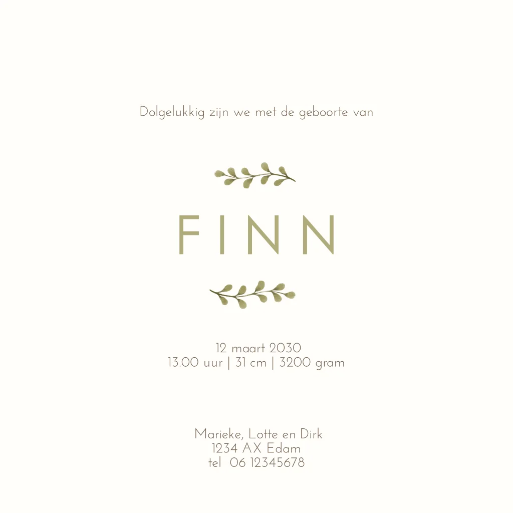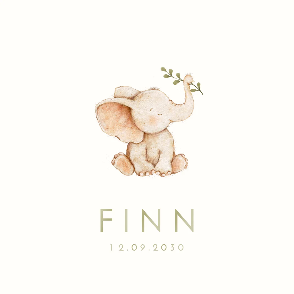 Een lief neutraal geboortekaartje voor jullie toekomstige kleintje. Het kaartje heeft een schattige illustratie van een watercolour olifantje. Het olifantje heeft een groen takje vast. Pas het ontwerp naar wens aan in onze online editor.