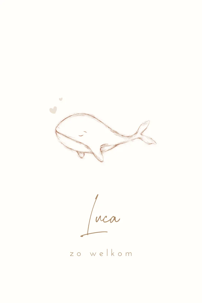 Prachtig geboortekaartje met lijntekening van walvis en hartjes