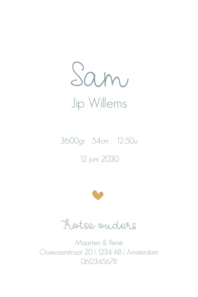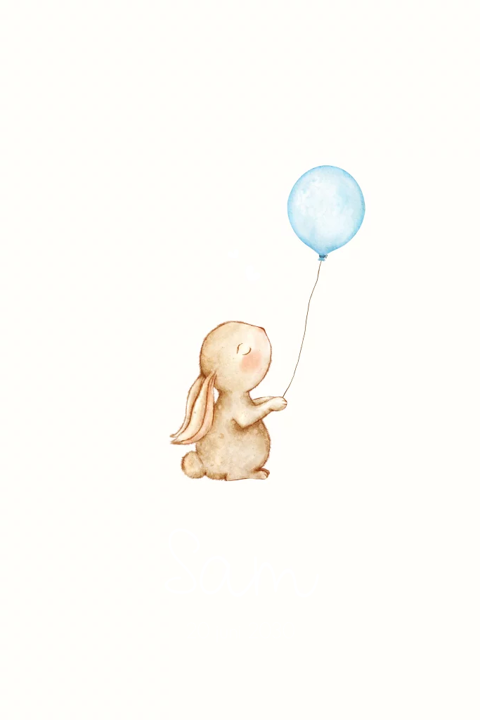 Een lief geboortekaartje voor jullie zoontje. Het kaartje heeft een schattige illustratie van een konijntje met een blauw ballonnetje. De naam en geboortedatum wordt gedrukt in goudfolie. Dit lieve geboortekaartje is naar wens aan te passen in onze online editor.