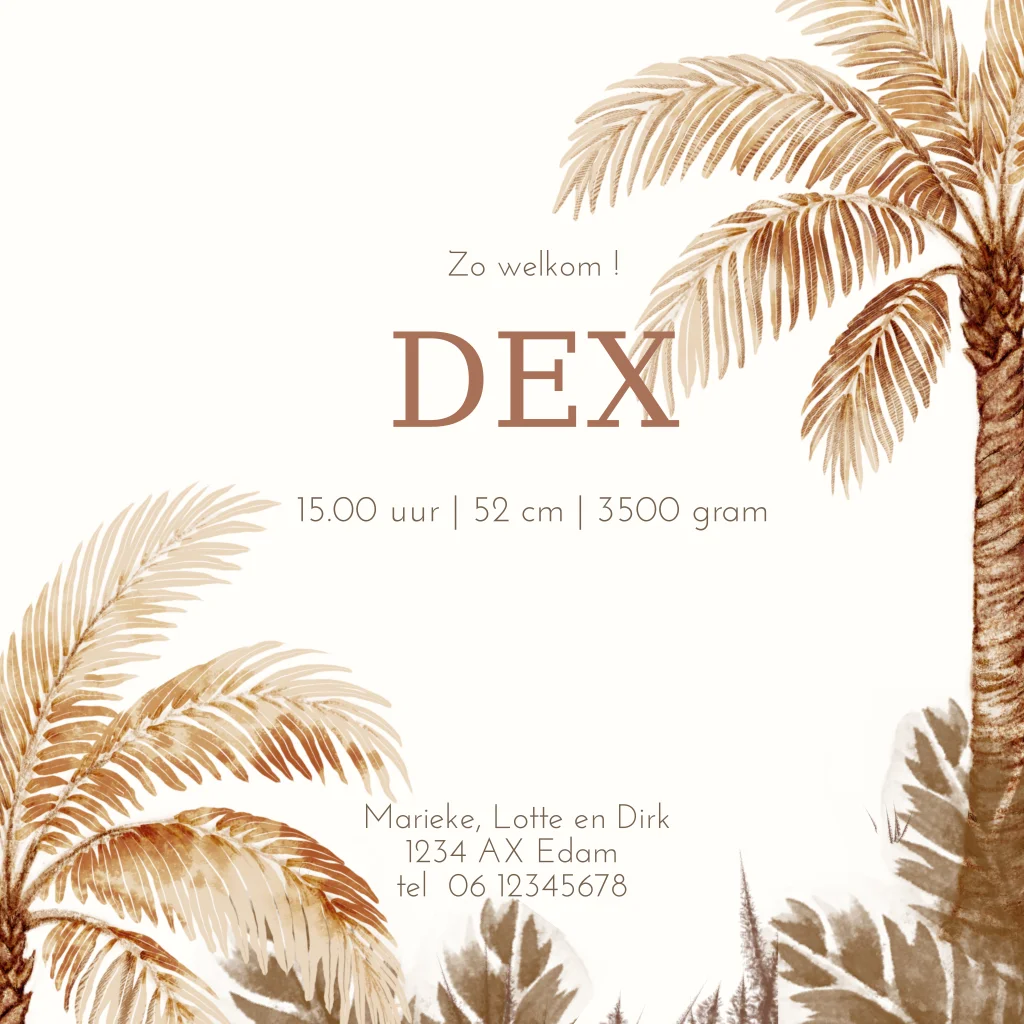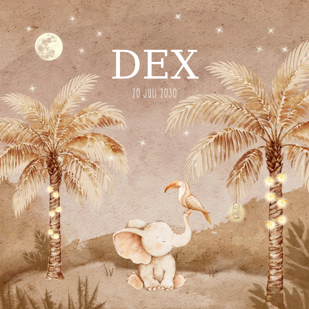 Dit geboortekaartje is perfect voor ouders die houden van een trendy jungle look zonder felle kleuren. De combinatie van het schattige olifantje en de elegante vogel zorgt voor een speels maar verfijnd ontwerp. Ideaal om de geboorte van jullie kindje op een warme en unieke manier aan te kondigen.