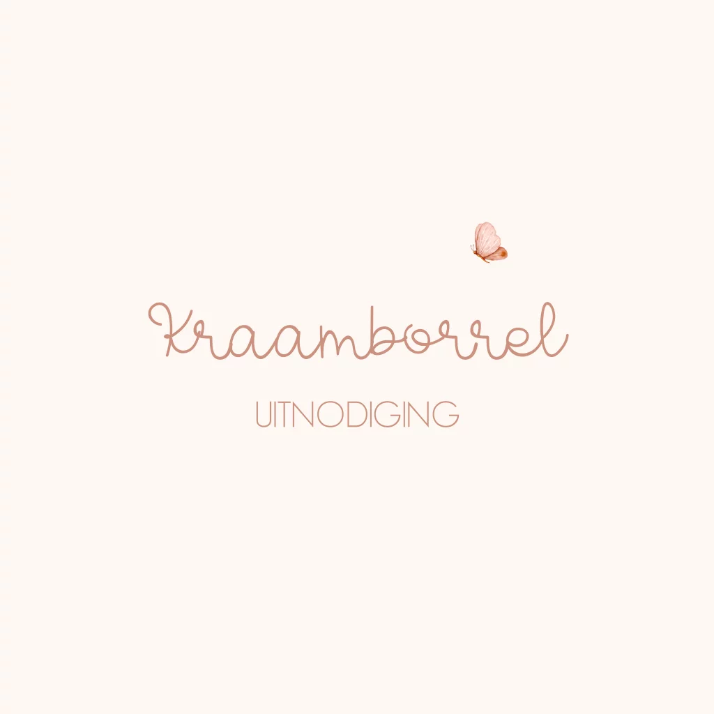 Een lieve kraamborrel uitnodiging voor jouw kindjes kraamborrel. Het kaartje heeft een creme kleur achtergrond. Daarnaast zie je een lief vlindertje. Personaliseer de uitnodiging naar wens.