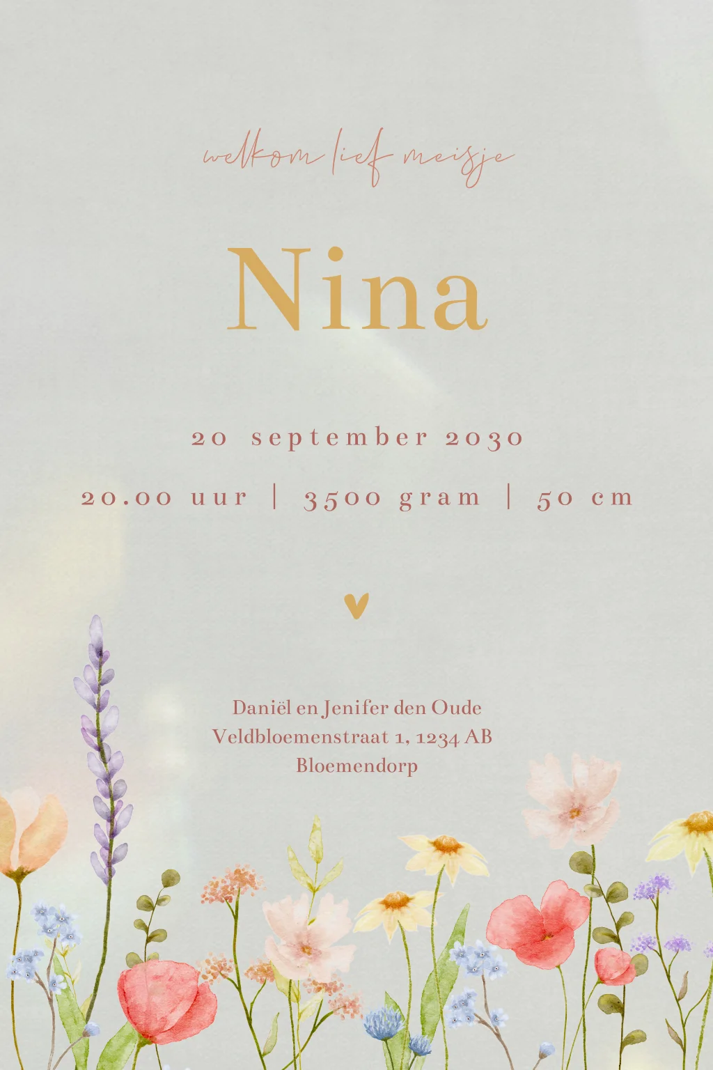 Een romantisch geboortekaartje voor de geboorte van jullie dochtertje. Het kaartje heeft een prachtige illustratie van bloemen. De naam van jullie kleintje staat in het midden geschreven. In de online editor kan je de bloemen naar jou unieke wens rangschikken.