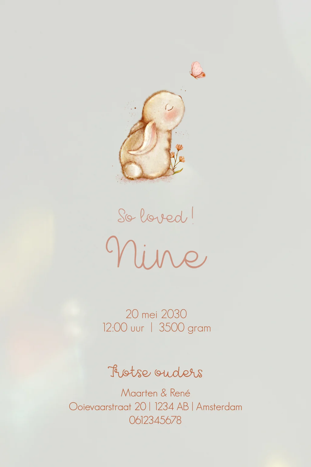 Een lief geboortekaartje voor jouw kindje. Het acryl geboortekaartje heeft een schattige illustratie van een konijntje op de voorzijde. Het konijntje krijgt gezelschap van een vlindertje. Pas het kaartje aan in onze online editor en bestel een proefdruk om het kaartje in het echt te bewonderen.