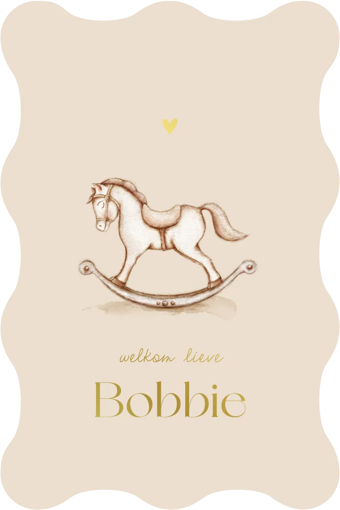 Een lief en uniek geboortekaartje in een warme beige tint. Op het kaartje zie je een ontwerp van een watercolour hobbelpaard. Pas het ontwerp naar wens aan in onze online editor.