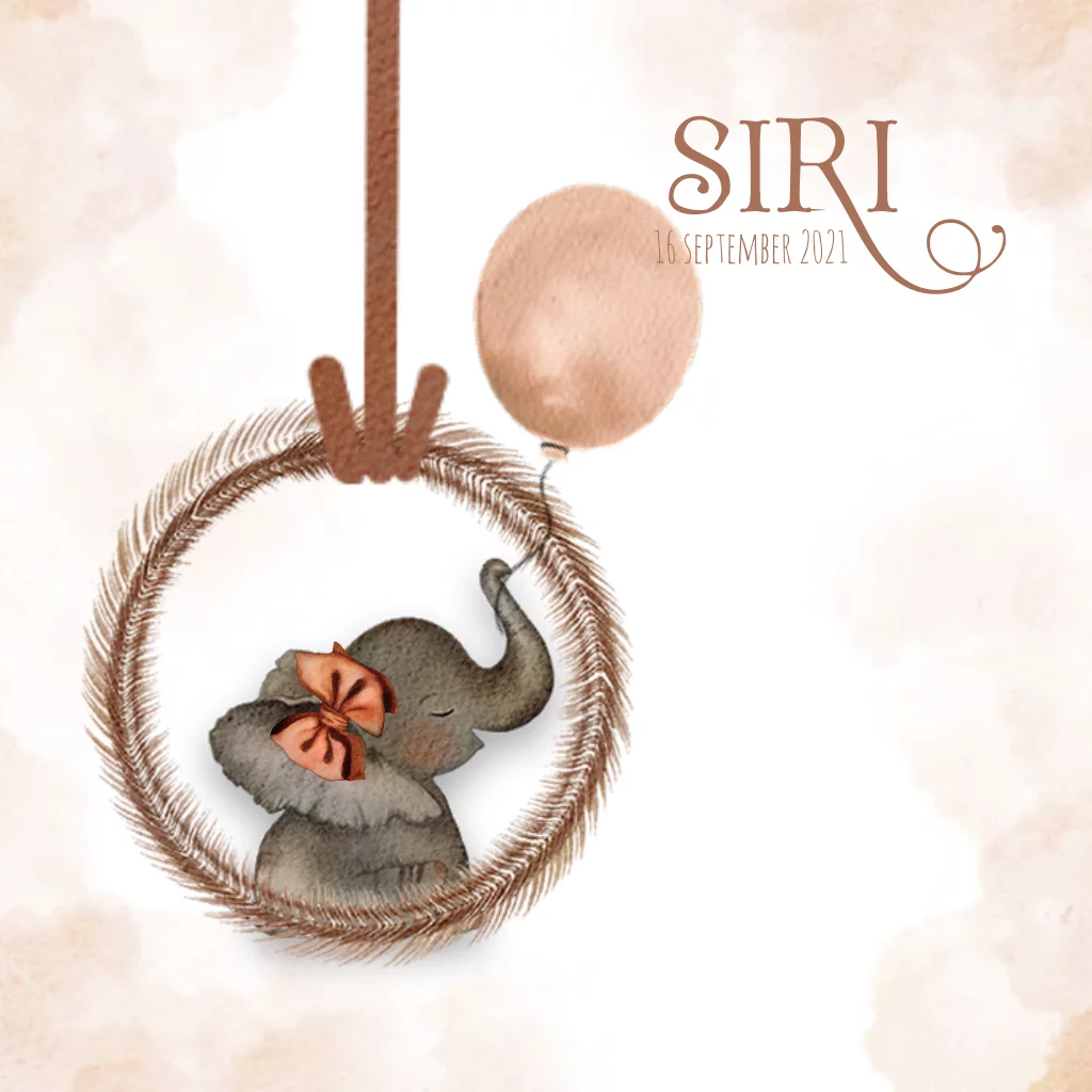 Trendy geboortekaartje voor de geboorteaankondiging van je dochter met waterverf. Het olifantje in een krans met een mooie strik en ballon, maken dit kaartje helemaal af!