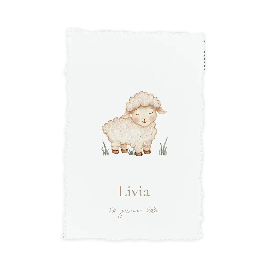 Een tijdloos geboortekaartje met de uitstraling van handgeschept papier. Op de voorkant staat een lief wit schaapje in zachte aquarelstijl, omringd door natuurlijke tinten. De subtiele structuur en warme kleuren geven dit kaartje een ambachtelijke en pure uitstraling.