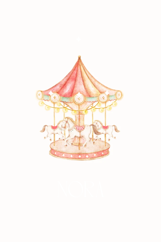 Een betoverend geboortekaartje met een illustratie van een carrousel met sierlijke paardjes. Het kaartje heeft zachte roze en rode tinten. De naam wordt gedrukt in goudfolie. Pas het ontwerp naar wens aan in onze online editor.