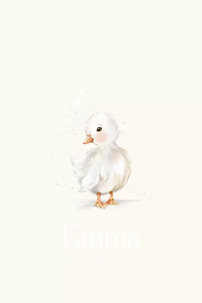 Lief babykaartje met lieve illustratie van een eendje. De naam en hartjes zijn gedrukt in goudfolie. Personaliseer dit geboortekaartje gemakkelijk in de online editor en verstuur om de geboorte van jullie dochter aan te kondigen!
