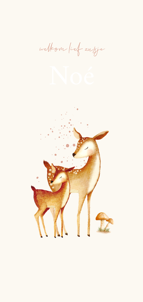 Een lief romantisch geboortekaartje voor jullie kindje. Het is een minimalistisch geboortekaartje met illustratie van twee hertjes, leuk voor wanneer er een zusje bijkomt. De naam is gedrukt in goudfolie.