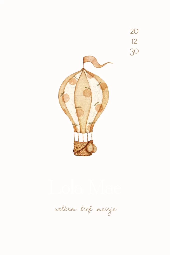 Een lief neutraal geboortekaartje voor jullie toekomstige kleintje. Het kaartje heeft een schattige illustratie van een luchtballon met sinaasappeltjes. De pastel tinten maken het kaartje helemaal af. De letters zijn voorzien van rosé goudfolie. Pas dit kaartje volledig aan naar wens in onze online editor.