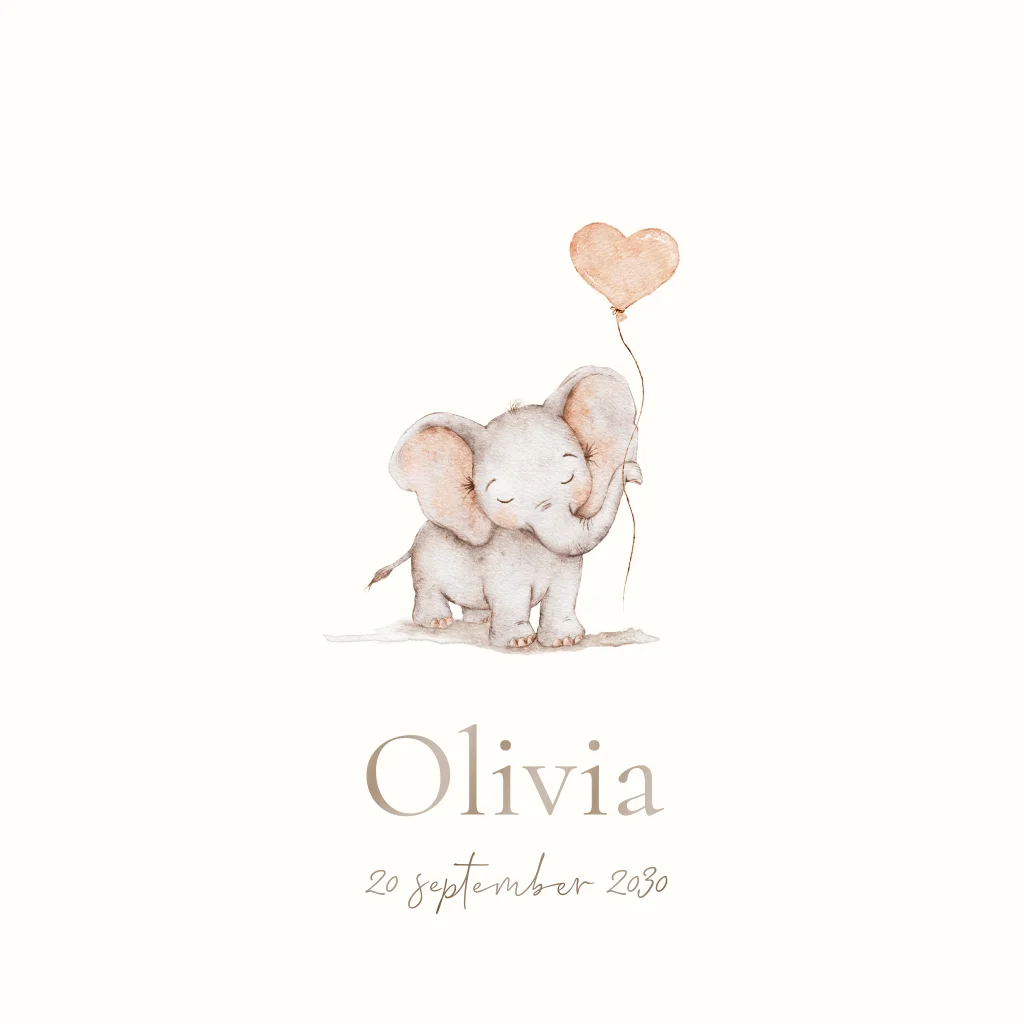 Wat een schattig geboortekaartje voor jouw dochter. Dit lieve geboortekaartje heeft een illustratie van een olifantje en roze hartjes ballon. Het kaartje heeft een vierkant formaat en is naar wens volledig aan te passen.