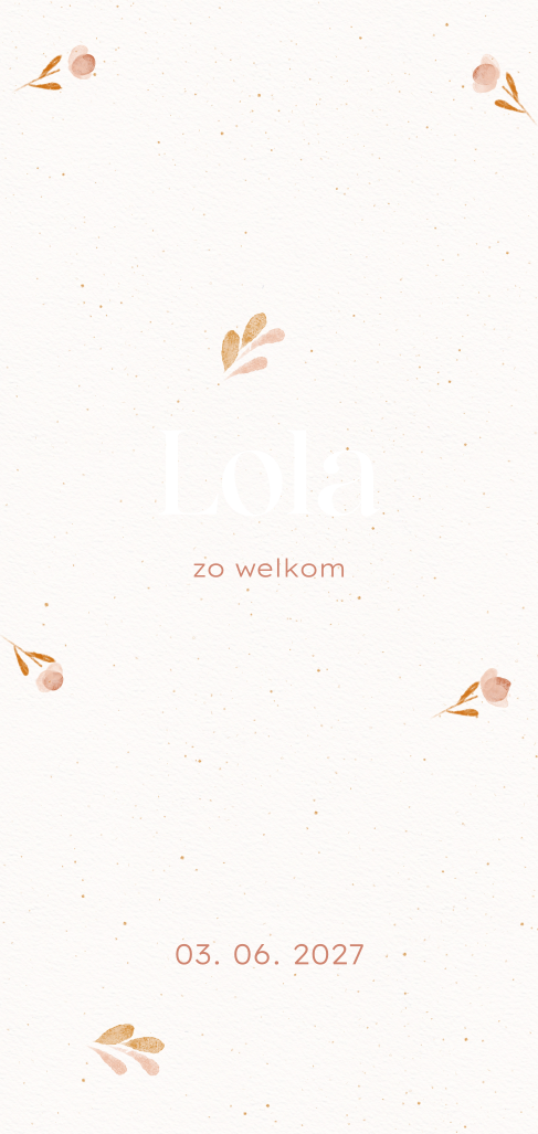 Een lief minimalistisch geboortekaartje voor jullie dochter. Het kaartje heeft een prachtige bloemen print. De naam wordt gedrukt in roségoudfolie. Het kaartje heeft een langwerpig formaat. Pas het ontwerp naar wens aan in onze online editor.