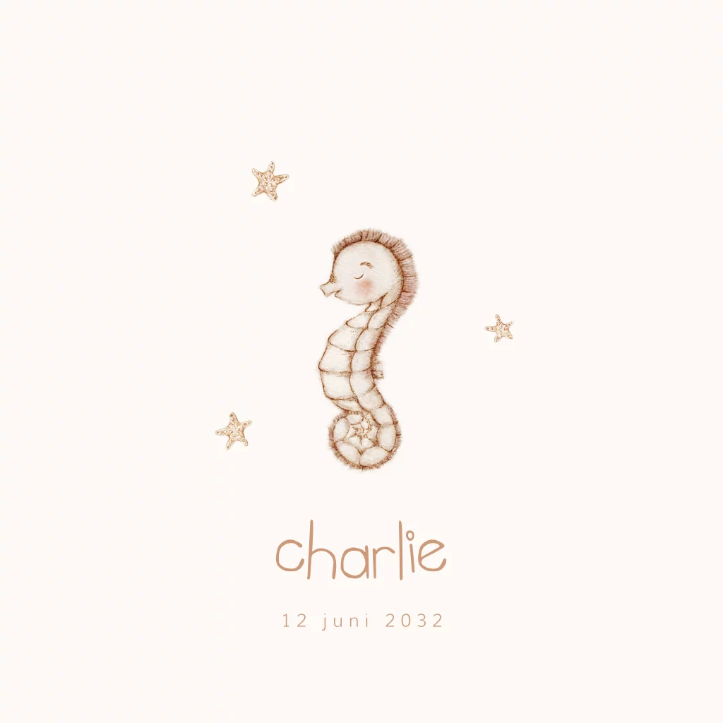 Prachtig geboortekaartje met watercolour zeepaardje en sterretjes