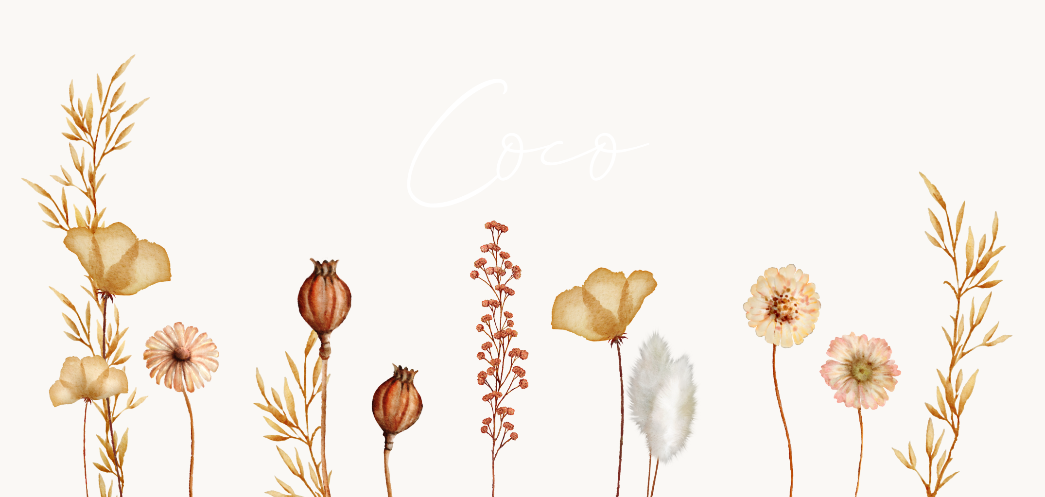 Een bijzonder geboortekaartje met gedroogde veldbloemen. De goudfolie en de handgetekende illustraties maken dit kaartje super lief, trendy en romantisch.