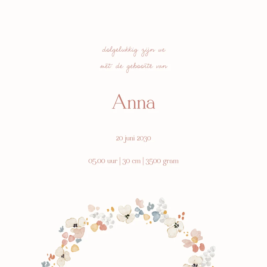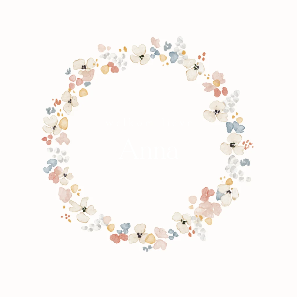 Een lief geboortekaartje voor een meisje. Het kaartje heeft een vierkant formaat met lichte achtergrond. Op het kaartje zie je een watercolour krans. In het midden lees je de naam gedrukt in goudfolie. Pas het ontwerp naar wens zelf aan.