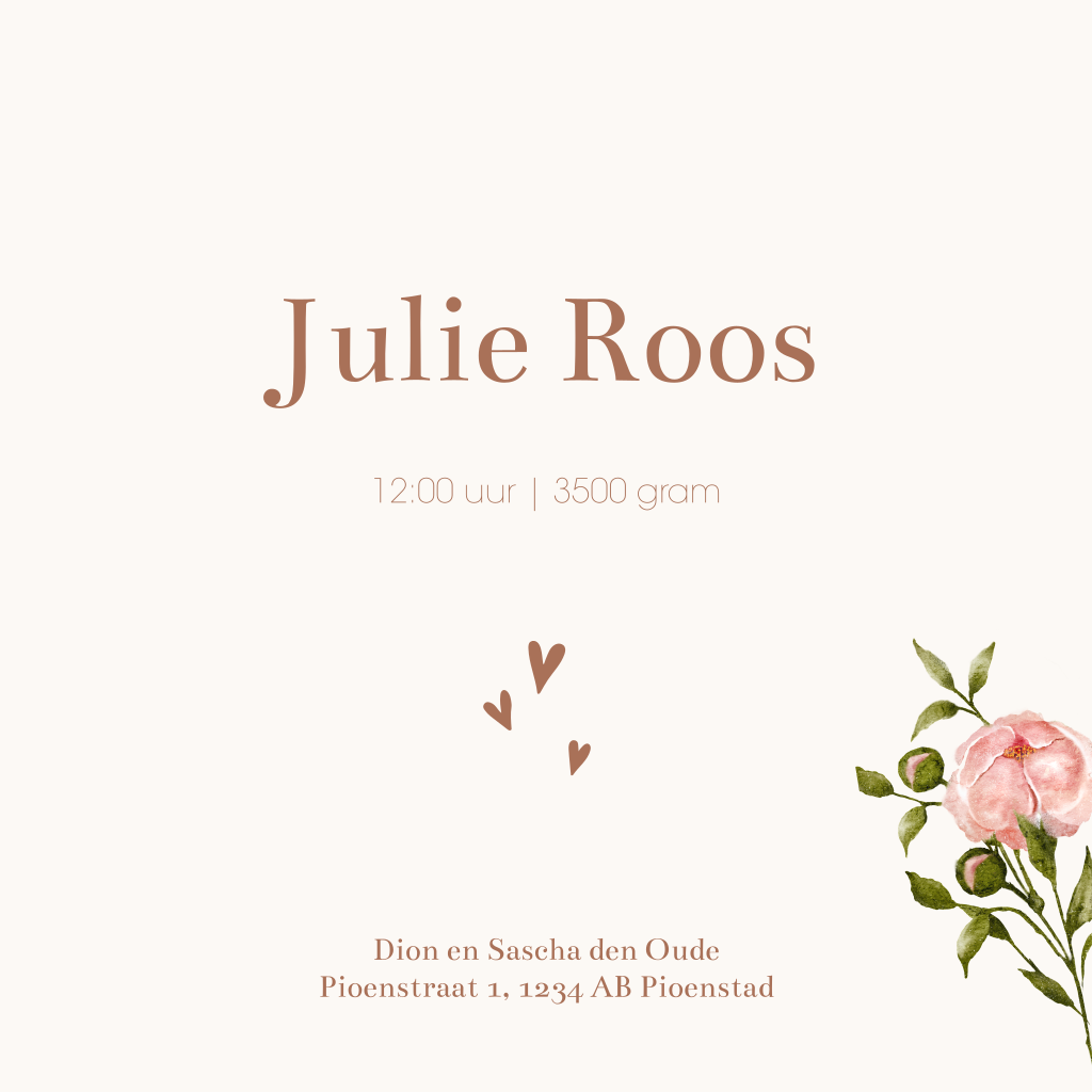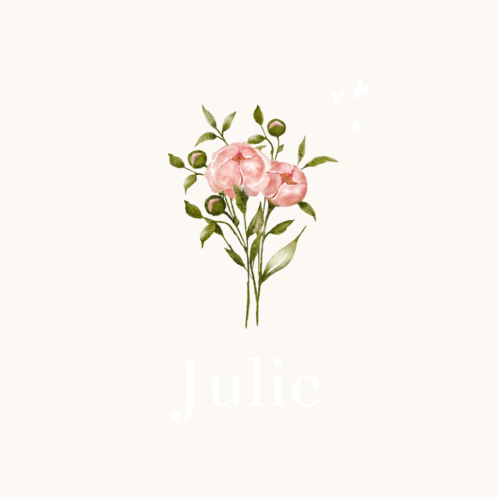Een lief en romantisch geboortekaartje voor jullie meisje. Het kaartje heef een vierkant formaat en verschillende roségoudfolie details. Op het geboortekaartje zie je een prachtige illustratie van pioenrozen.