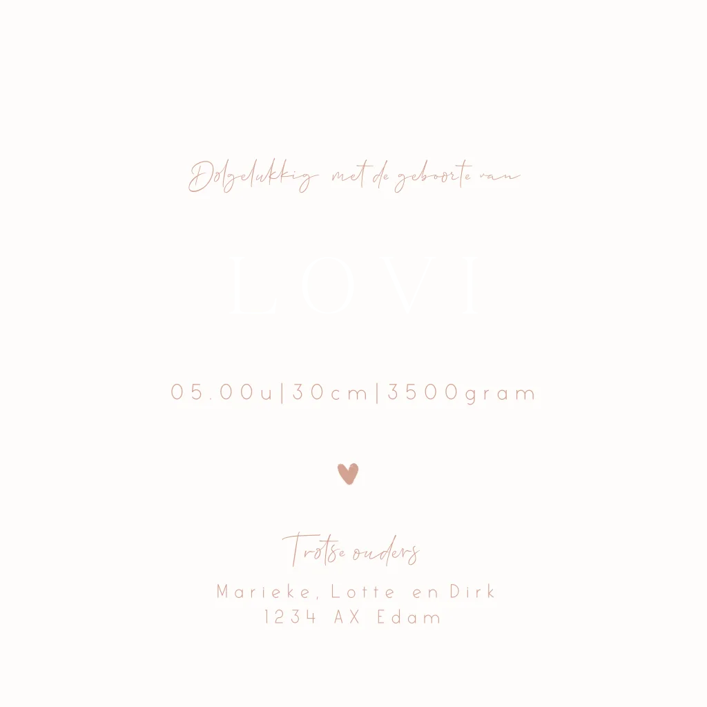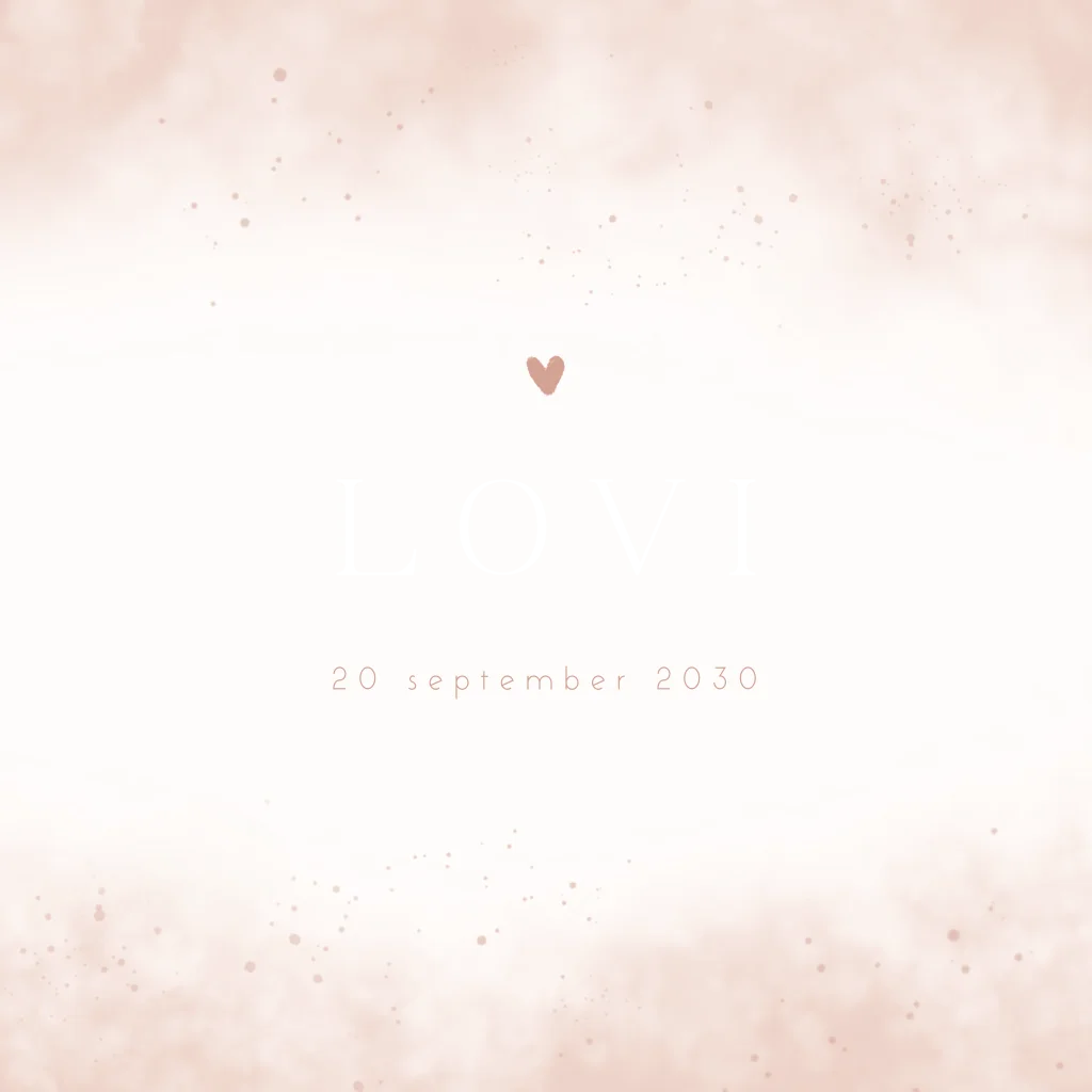 Een lief geboortekaartje voor jullie toekomstige meisje. Het kaartje heeft een dromerige roze watercolour achtergrond. De naam wordt gedrukt in roségoudfolie. Pas het ontwerp naar wens aan in onze online editor.
