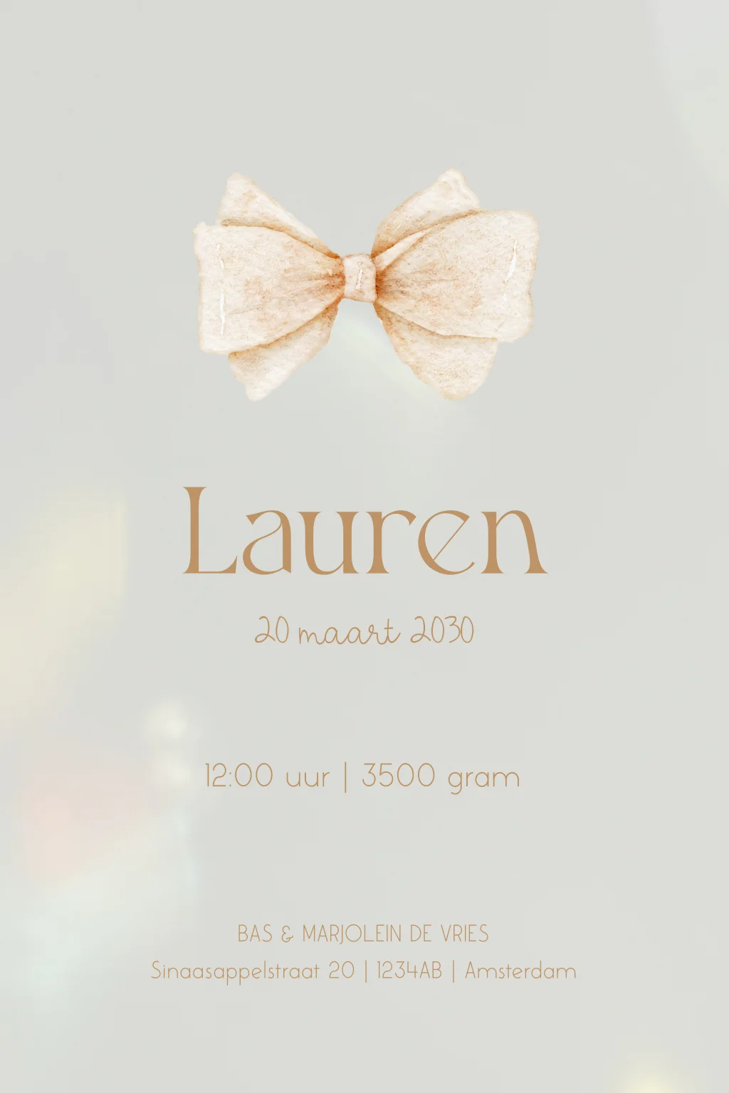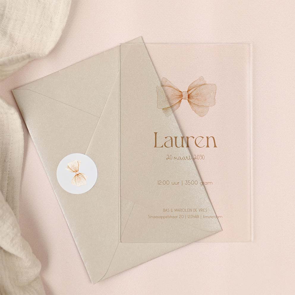 Dit klassieke elegante geboortekaartje heeft een zachte, beige watercolour strik. Het acryl kaartje heeft een staand formaat en is naar wens aan te passen in onze online editor.