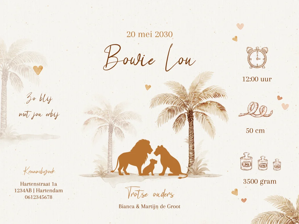 Hoe mooi: dit theatervouw geboortekaartje ontvouwt zich als een klein kunstwerk. In het midden staat een leeuwenfamilie, omringd door palmbomen en zachte beige tinten. Bewerk het ontwerp naar wens in de online editor.