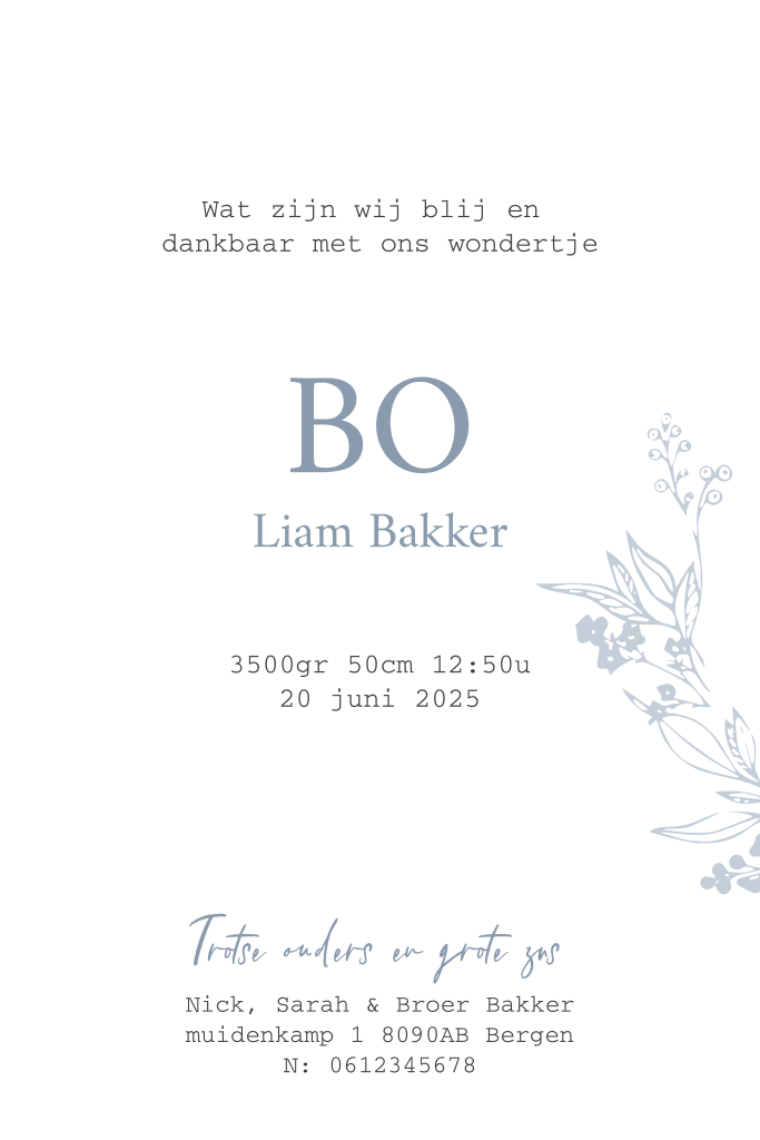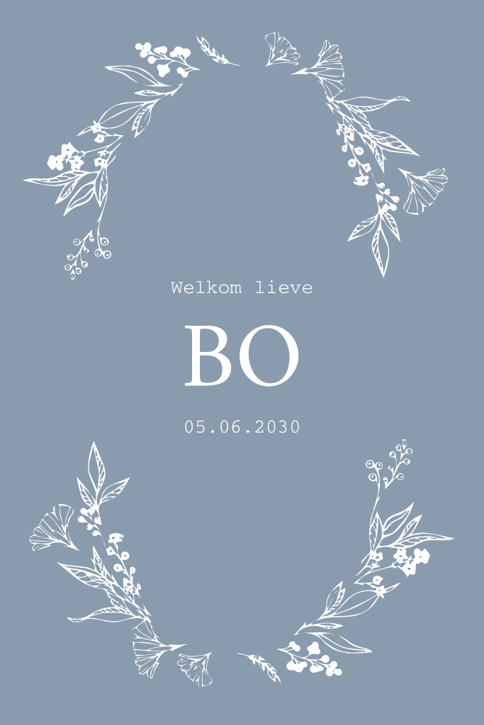 Hip en stijlvol geboortekaartje voor je zoon of dochtertje met takjes. De takjes zijn gedrukt in holografische folie op een grijs-blauwe achtergrond. Pas het kaartje naar wens aan in onze online editor.