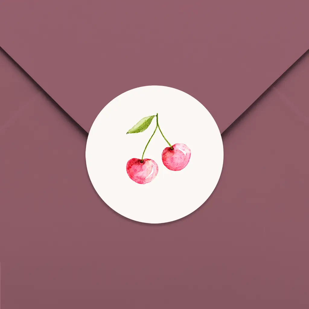 Maak de envelop compleet met een bijpassende sluitsticker. De sticker heeft een lichte achtergrond met daar op een illustratie van kersen.