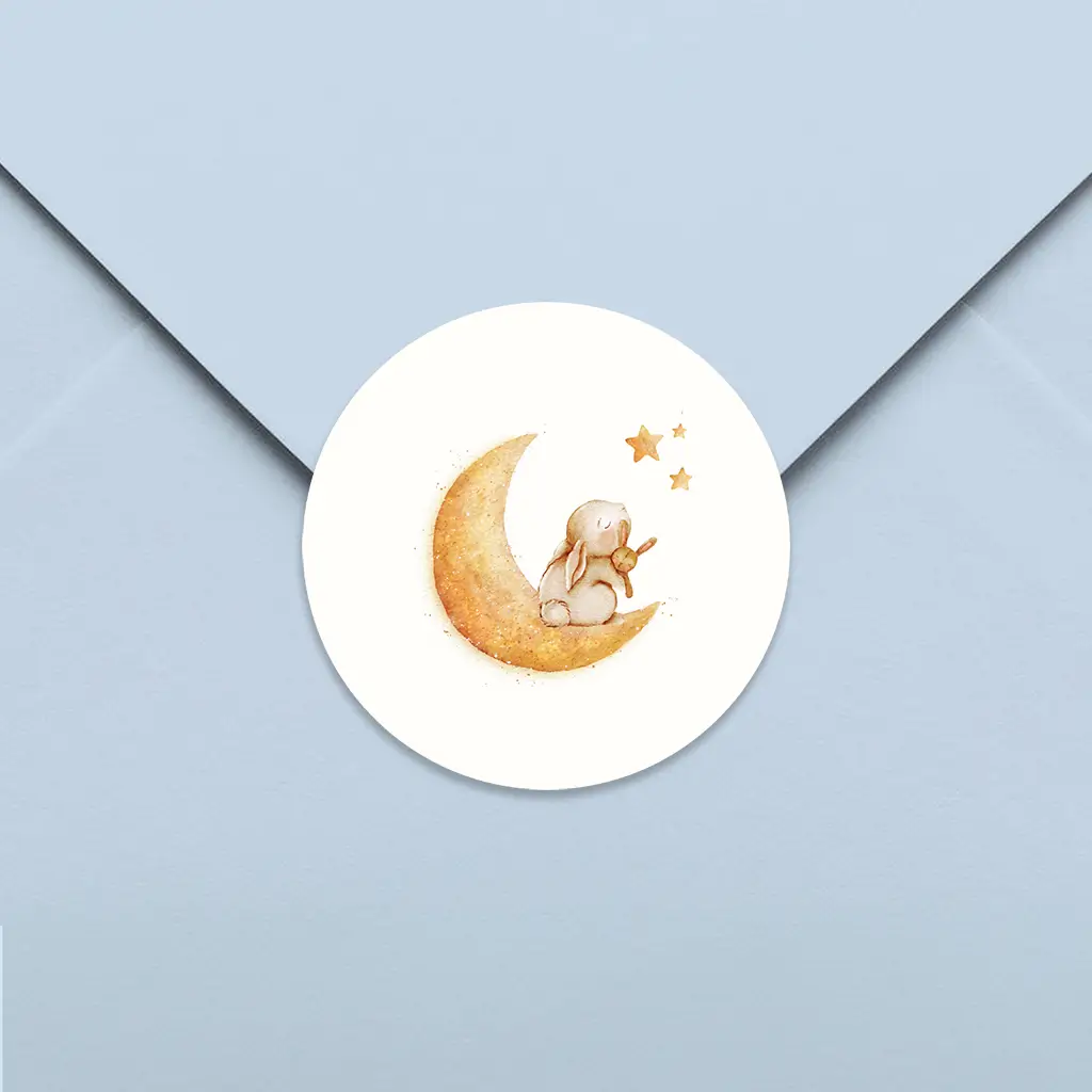 Een lieve sluitsticker passend bij het kaartje voor jouw kindje. De sticker heeft een beige achtergrond met daarop een schattige illustratie van een konijntje op de maan.
