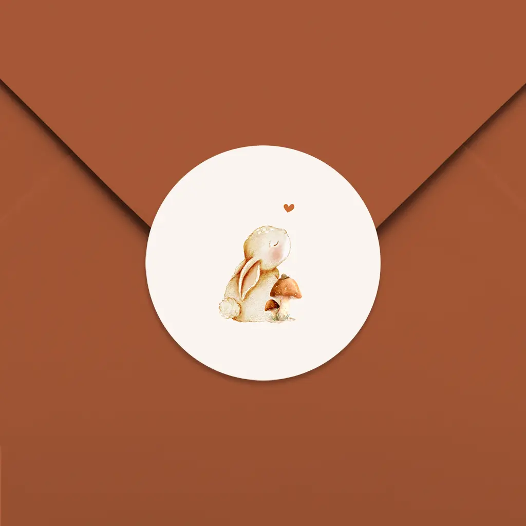 Een schattige sluitsticker voor bij het geboortekaartje. Op de sticker zie je een illustratie van paddestoelen en een lief konijntje. Pas het ontwerp naar wens zelf aan.