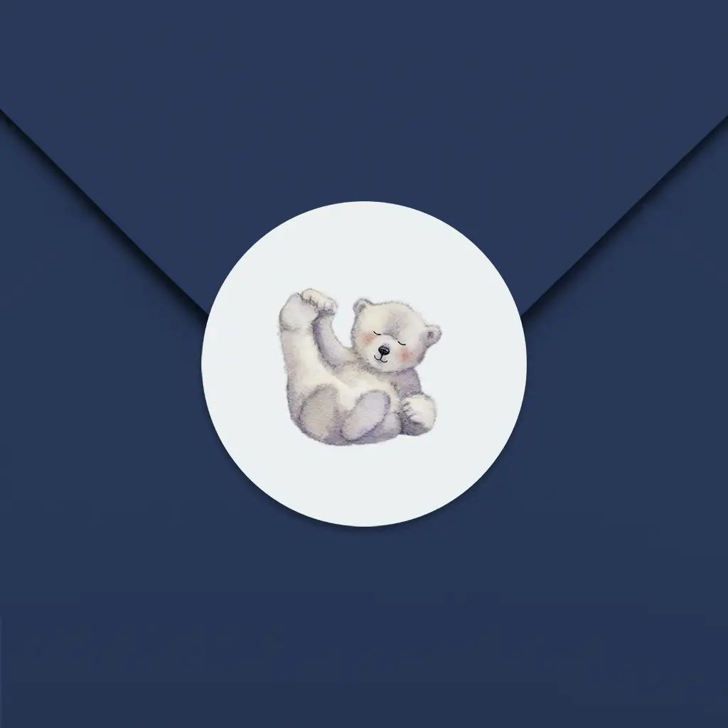 Deze sluitsticker maakt de geboorteaankondiging van jullie zoontje helemaal af. De sticker heeft een lichtblauwe achtergrond met daarop een lieve illustratie van een ijsbeer. De sluitstickers hebben een diameter van 35 mm en worden geleverd op vellen van 25 stuks.