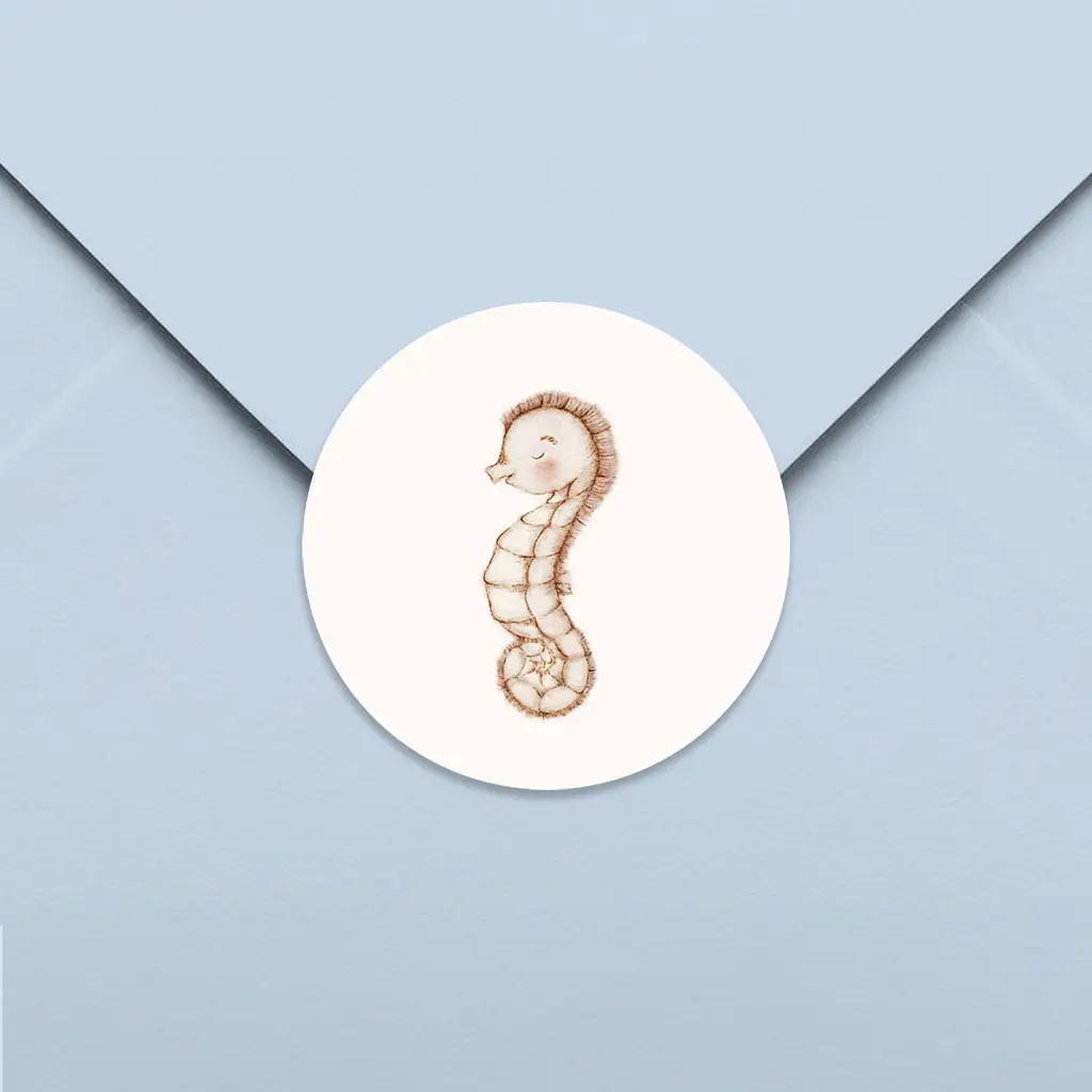 Maak het openen van de envelop een feestje met deze sluitsticker. Op de sluitsticker staat een watercolour zeepaardje. De sluitsticker is naar wens aan te passen in onze online editor.