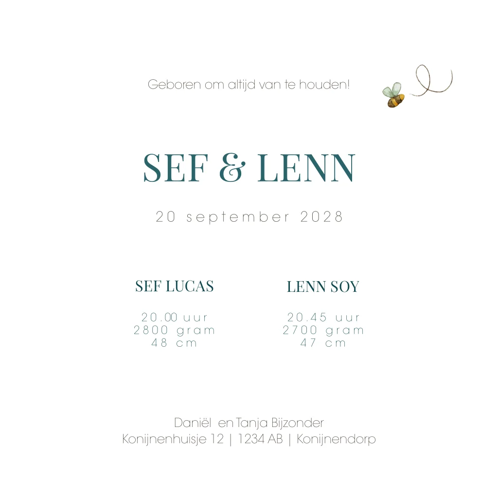 Een stijlvol tweeling geboortekaartje voor jouw kindje. Het kaartje heeft een vierkant formaat met prachtige watercolour illustraties. Je ziet twee konijntjes en een bijtje. Pas het ontwerp naar wens aan in onze online editor.