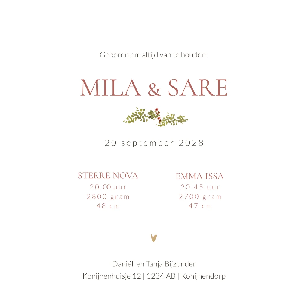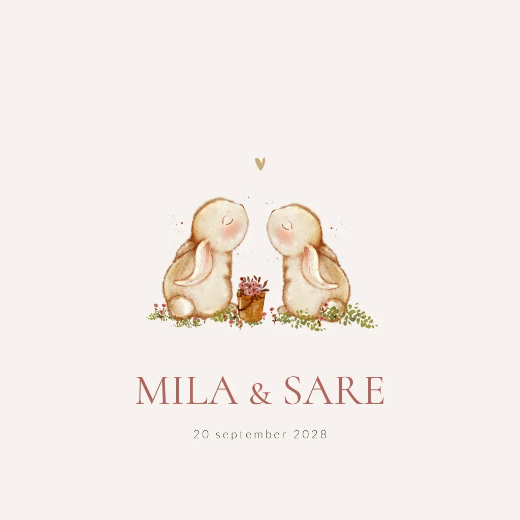 Een stijlvol tweeling geboortekaartje voor jouw tweeling. Het kaartje heeft een vierkant formaat met prachtige watercolour illustraties. Je ziet twee konijntjes. Pas het ontwerp naar wens aan in onze online editor.