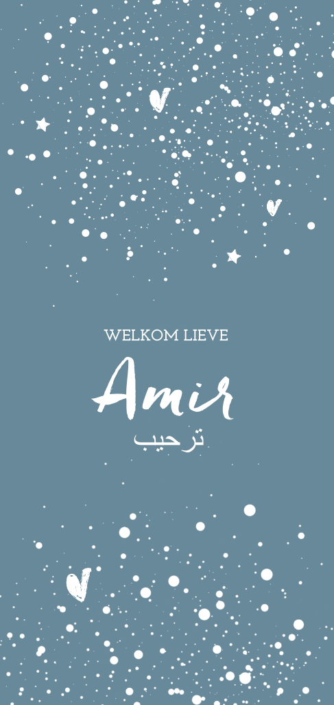 Islamitisch geboortekaartje om de geboorte van je zoontje aan te kondigen! Met witte verf spatten op een blauwe achtergrond lijkt het net een sterrenhemel. Ook leuk: Schrijf de babynaam ook in het Arabische schrift.
