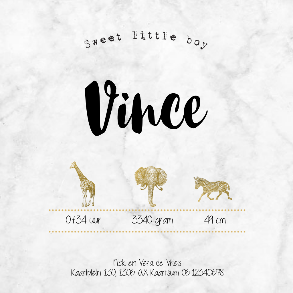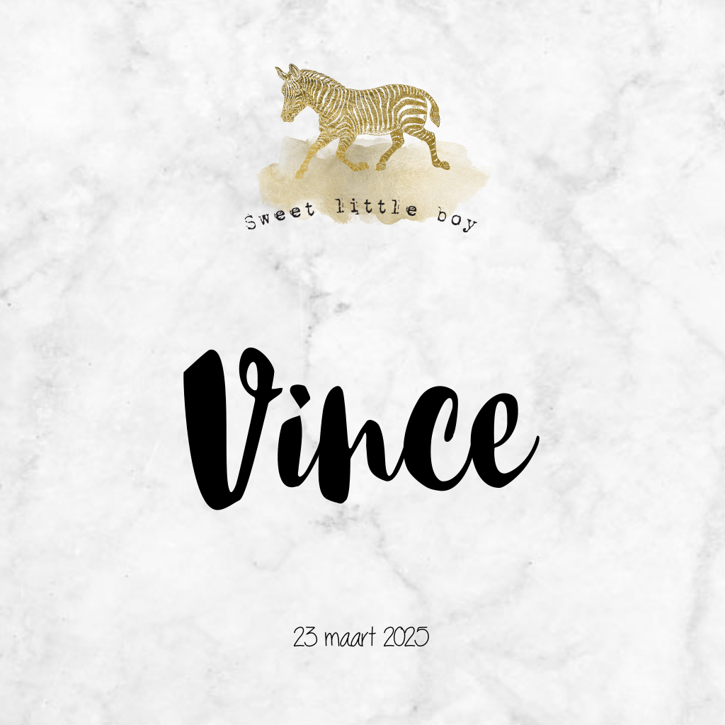 Wat een hippe geboortekaart met een marmerachtergrond en een zebra in sepiakleur! De safaridieren komen ook aan de binnenkant van de kaart weer terug. Teksten en lettertypes zijn naar wens aan te passen. Hoe heet jouw 'sweet little boy'?