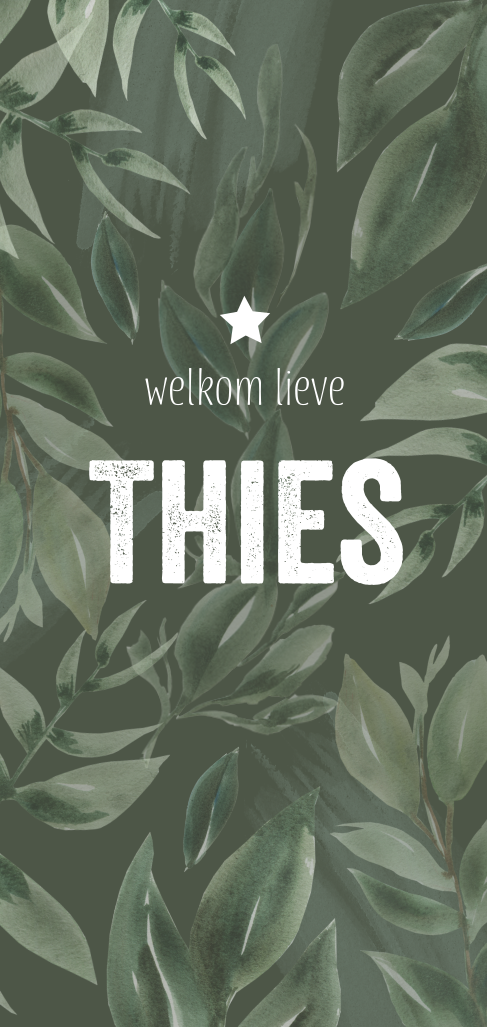 Langwerpig, stoer babykaartje in donkergroen met planten en een sterretje. Leuk voor een zoontje! Kleuren en lettertypes zijn naar wens aan te passen. Maak jij hem af?