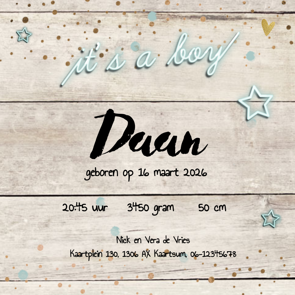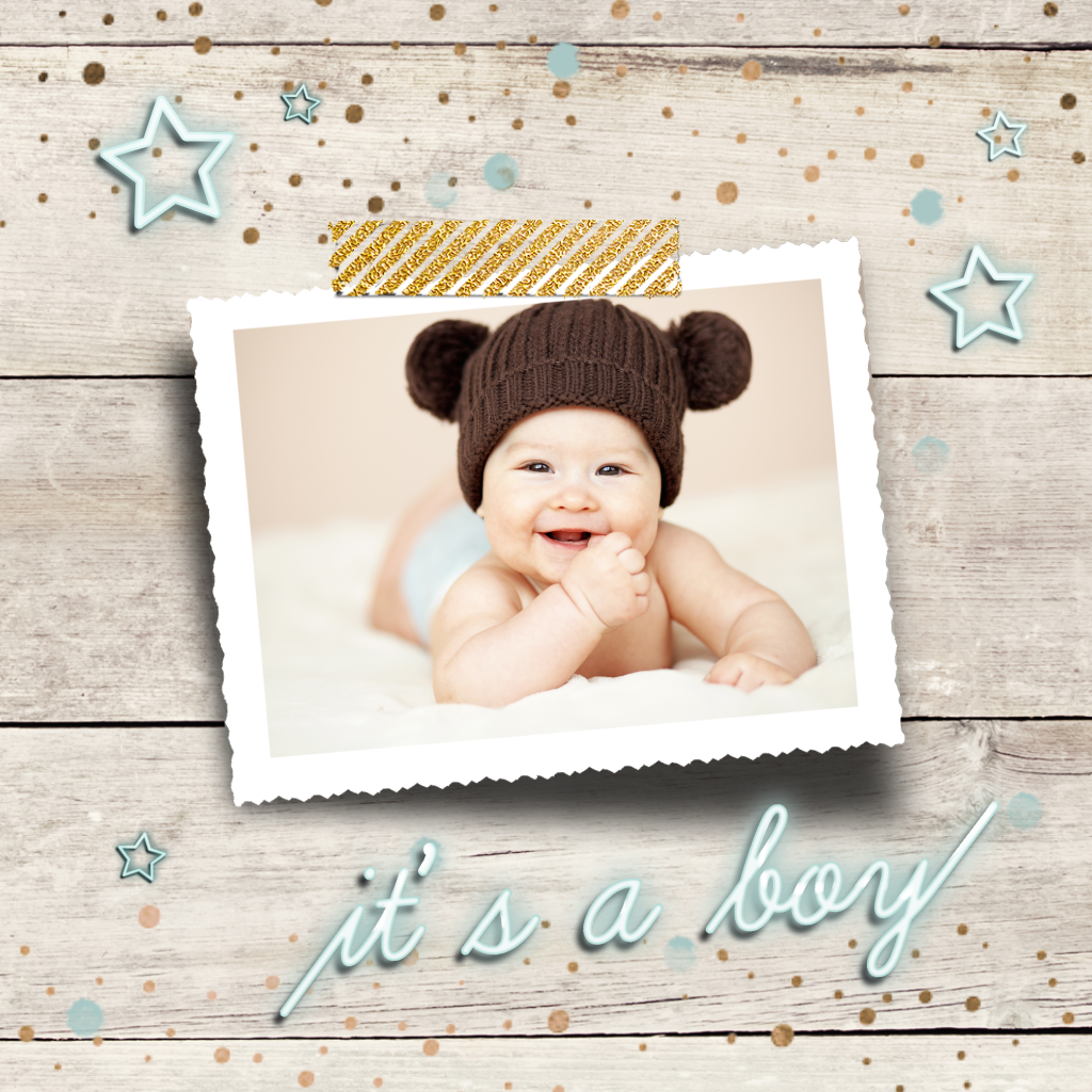 Uniek foto geboortekaartje voor een jongen met hout print op de ondergrond. Met neon effect sterren en tekst, foto kader, ster in goudlook en plakband elementjes en confetti.