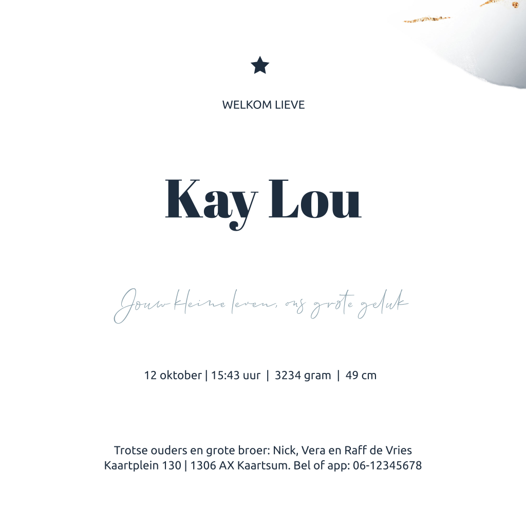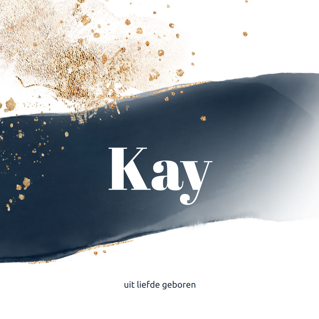 Dit stoere geboortekaartje is ontzettend mooi om de geboorte van jullie zoon mee aan te kondigen. Op het kaartje zie je een blauwe waterverf streep. Daarom zie je allemaal goudlook spetters. De naam in het stoere lettertype zorgt voor een hippe uitstraling.