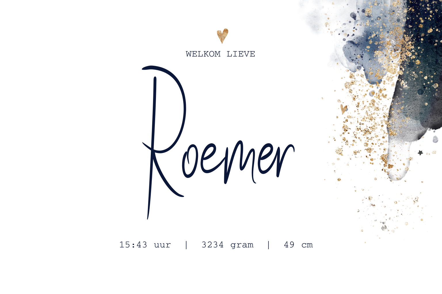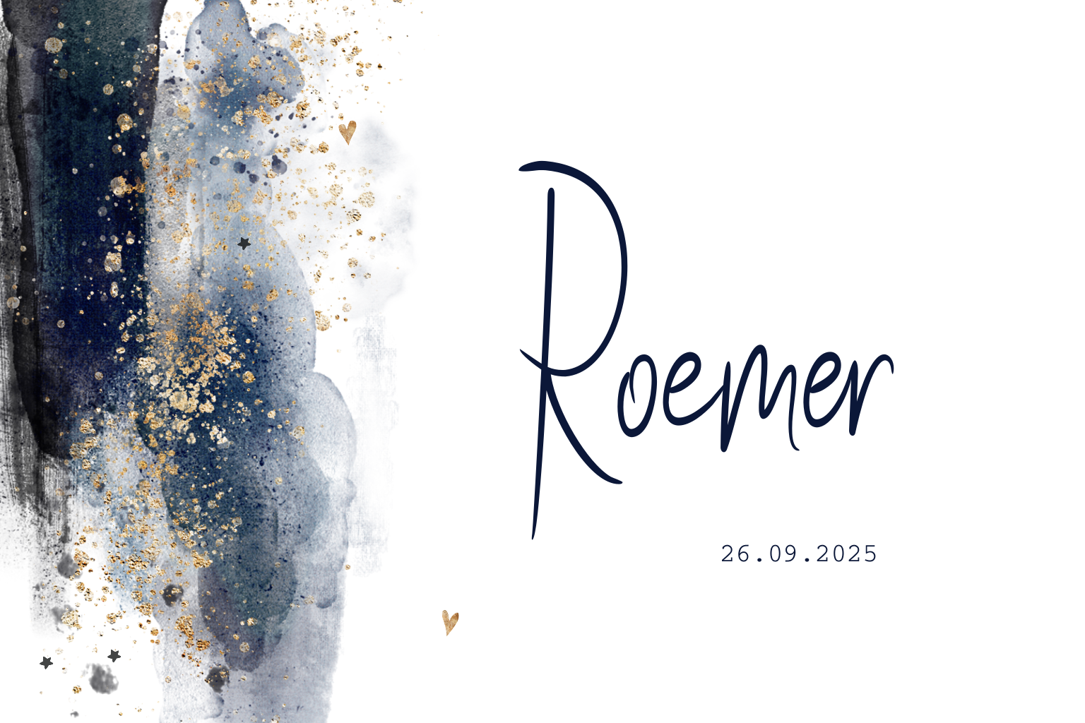 Origineel geboortekaartje voor je zoon met trendy aquarelverf in donkerblauw met goudlook accenten. Schrijf je eigen tekst, verander de achtergrondkleur en maak een uniek geboortekaartje!