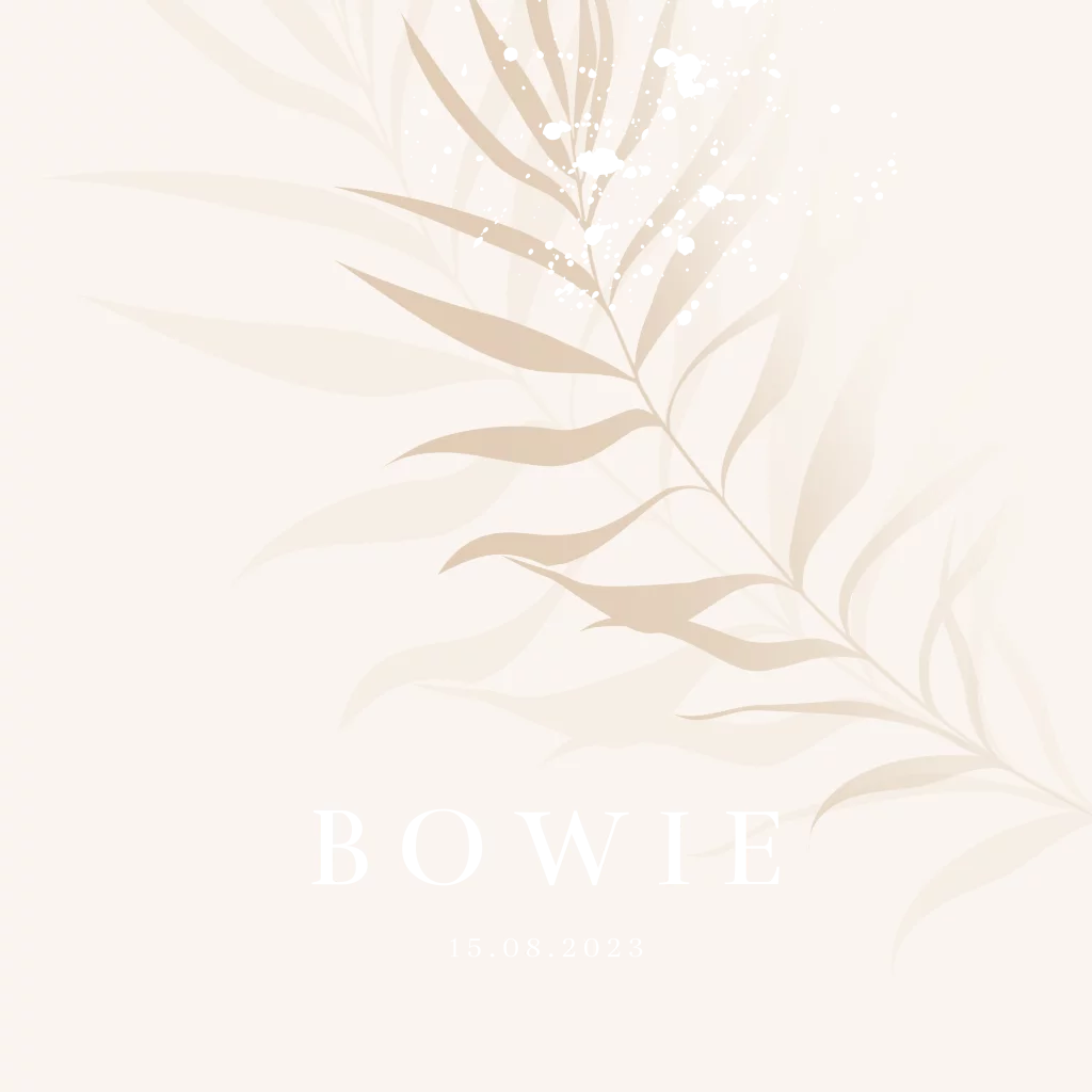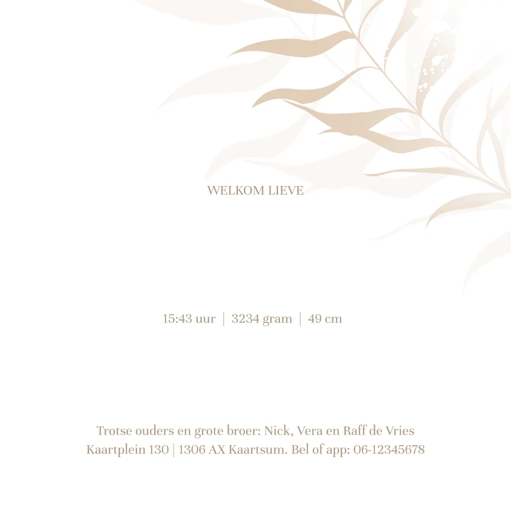 Een stijlvol geboortekaartje voor jouw kindje. Het kaartje heeft zachte beige tinten en goudfolie details. Op het kaartje zie je mooie jungle takken. Pas het ontwerp naar wens aan in onze online editor.
