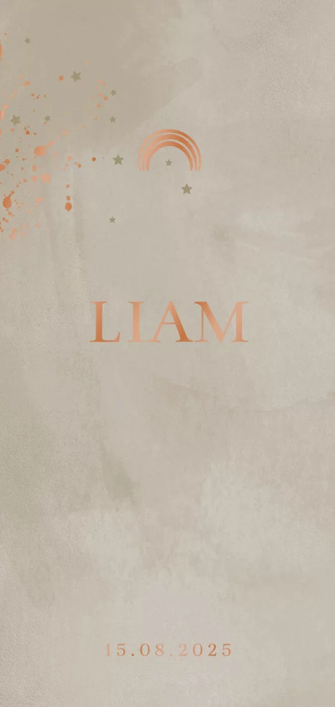Een stoer geboortekaartje voor jullie zoontje. Het kaartje heeft een toffe velvet-look achtergrond met daarop verschillende hoogglans elementen. De naam, spetters en regenboogje is gedrukt in hoogglans. Pas het kaartje naar wens aan in onze online editor.
