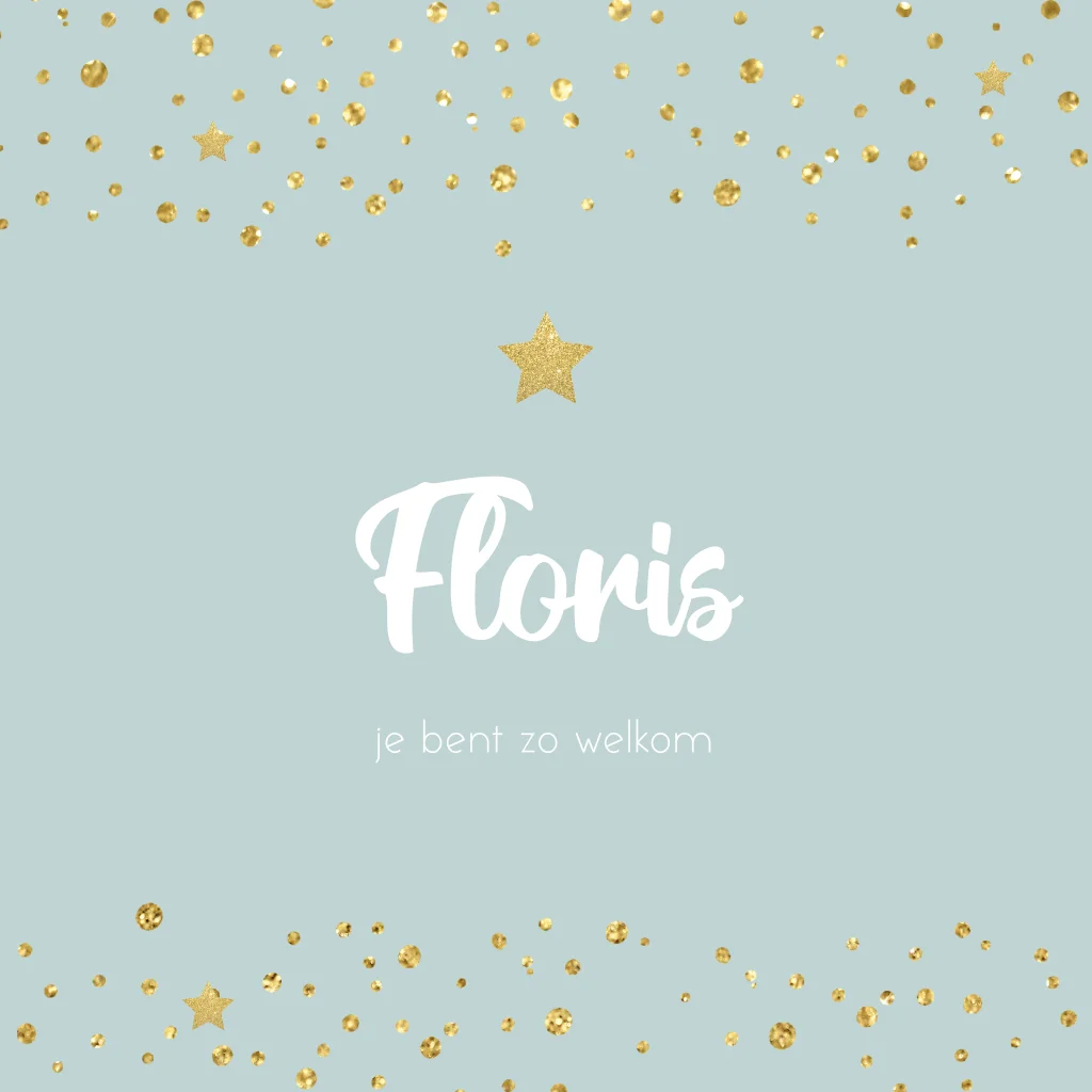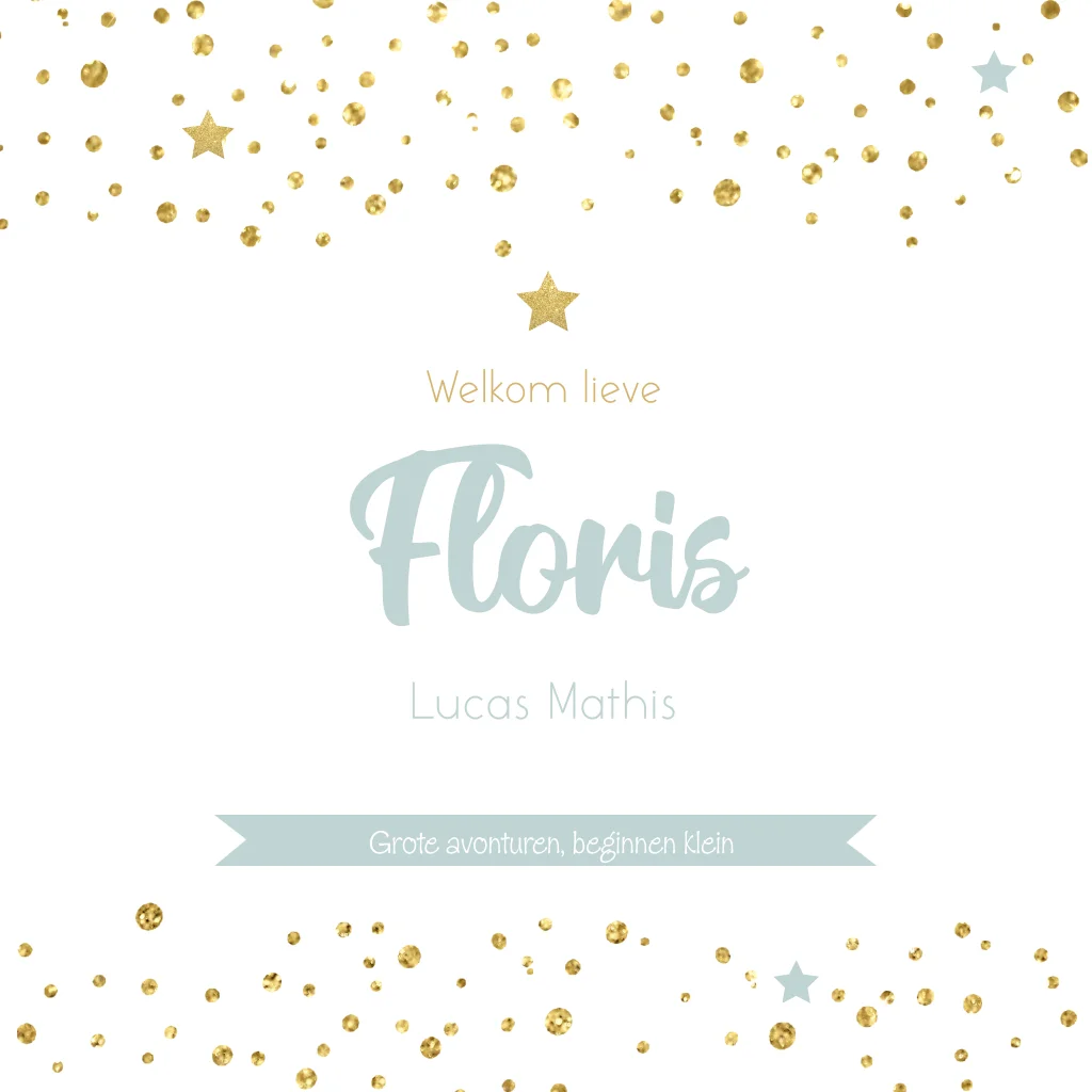 Chic kaartje voor de geboorte van jullie zoon in mint met confetti in goudlook.