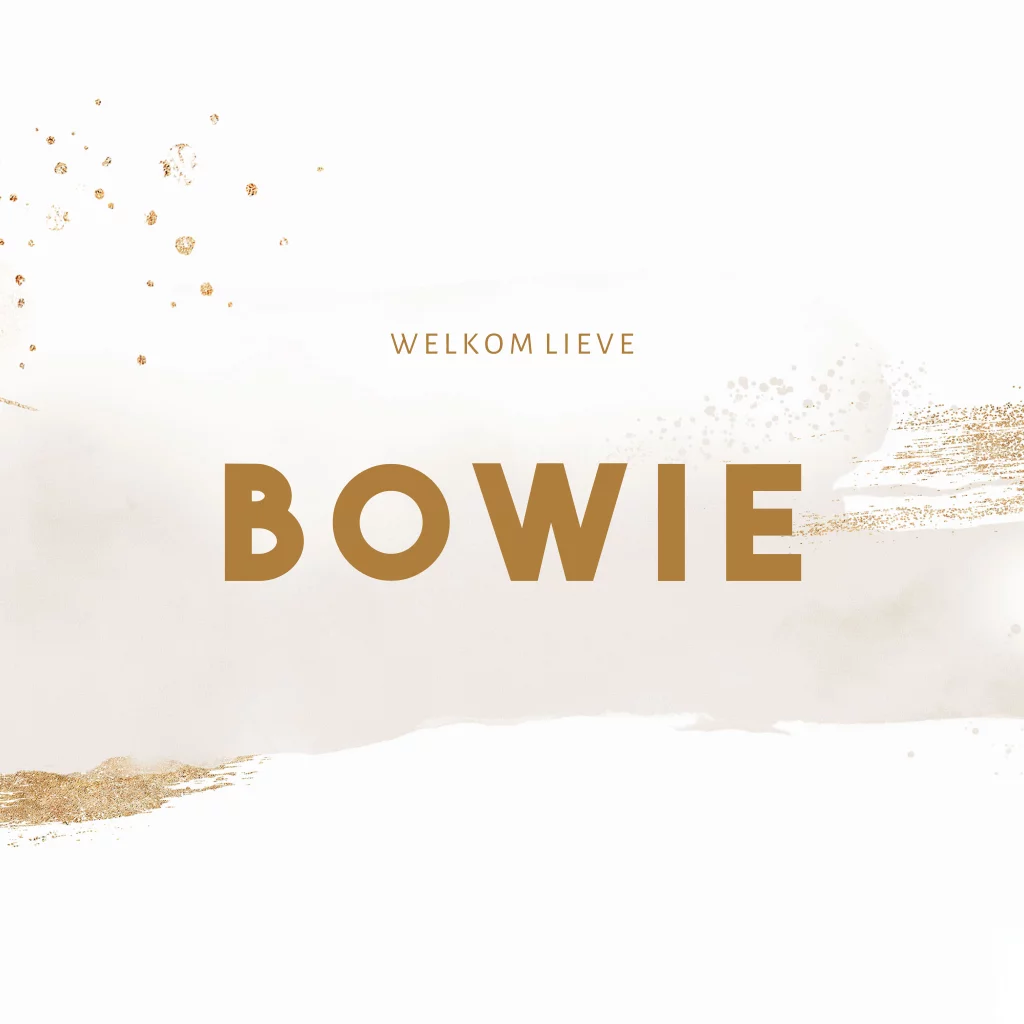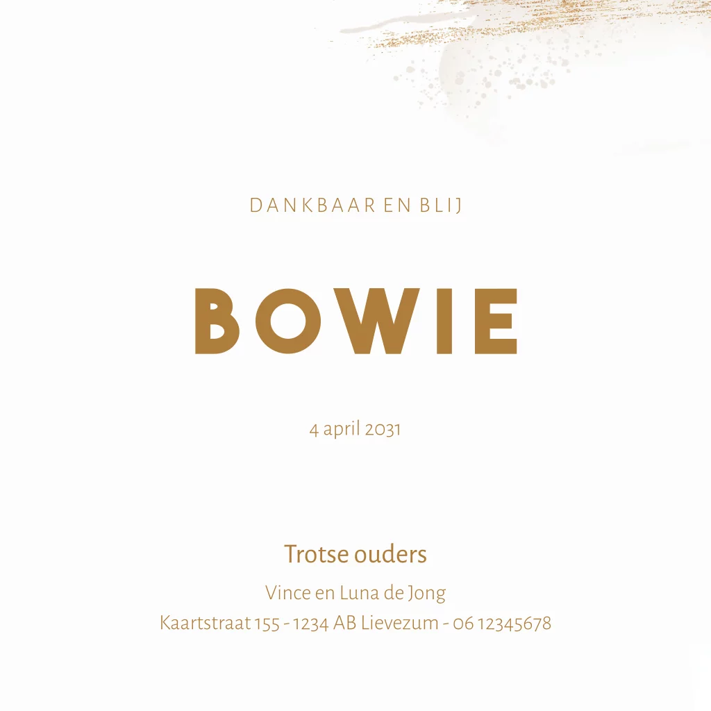 Een stijlvol geboortekaartje voor jouw kindje. Het kaartje heeft zachte beige tinten met watercolour en spetters. Pas het ontwerp naar wens aan in onze online editor.
