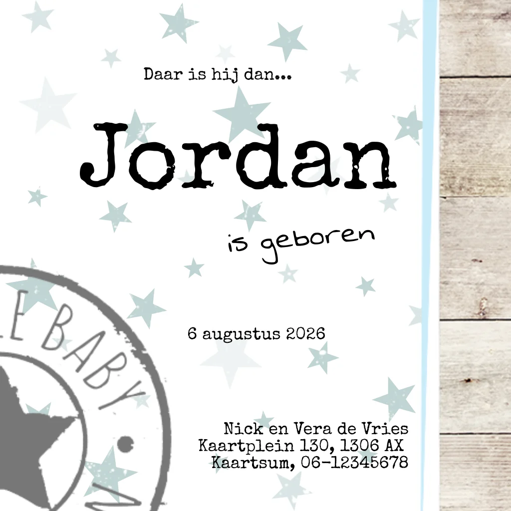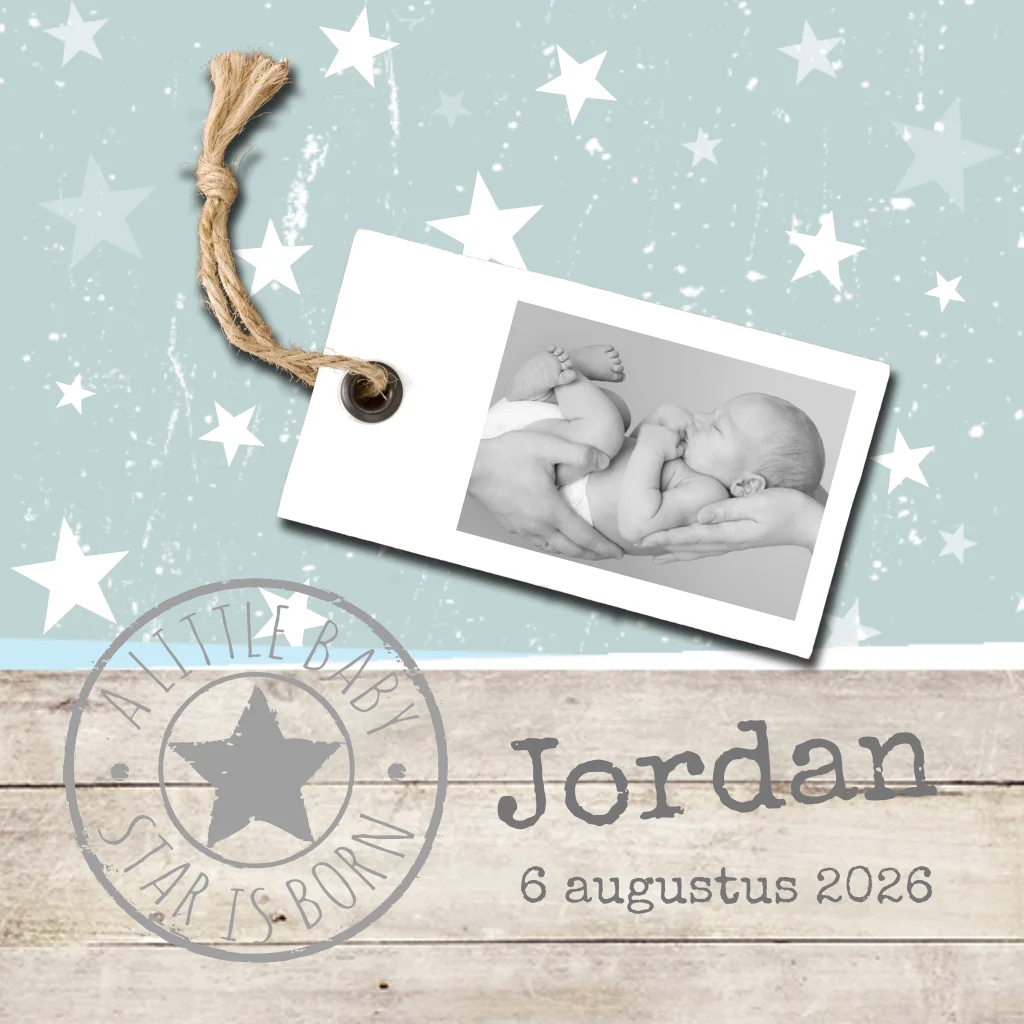 Jongens geboortekaartje met sterretjes en hippe stempel. Ruimte voor een foto op de leuke label.