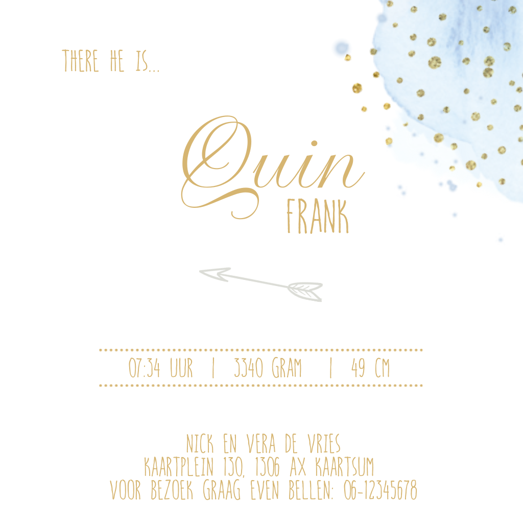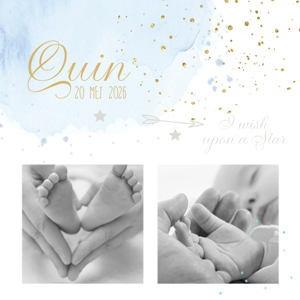 Zacht kleurige foto geboortekaartje voor een jongen met watercolour, sterren, confetti spetters, pijltjes, foto collage met ruimte voor twee eigen foto's of andere leuke invulling! Met lieve licht blauwe tinten.