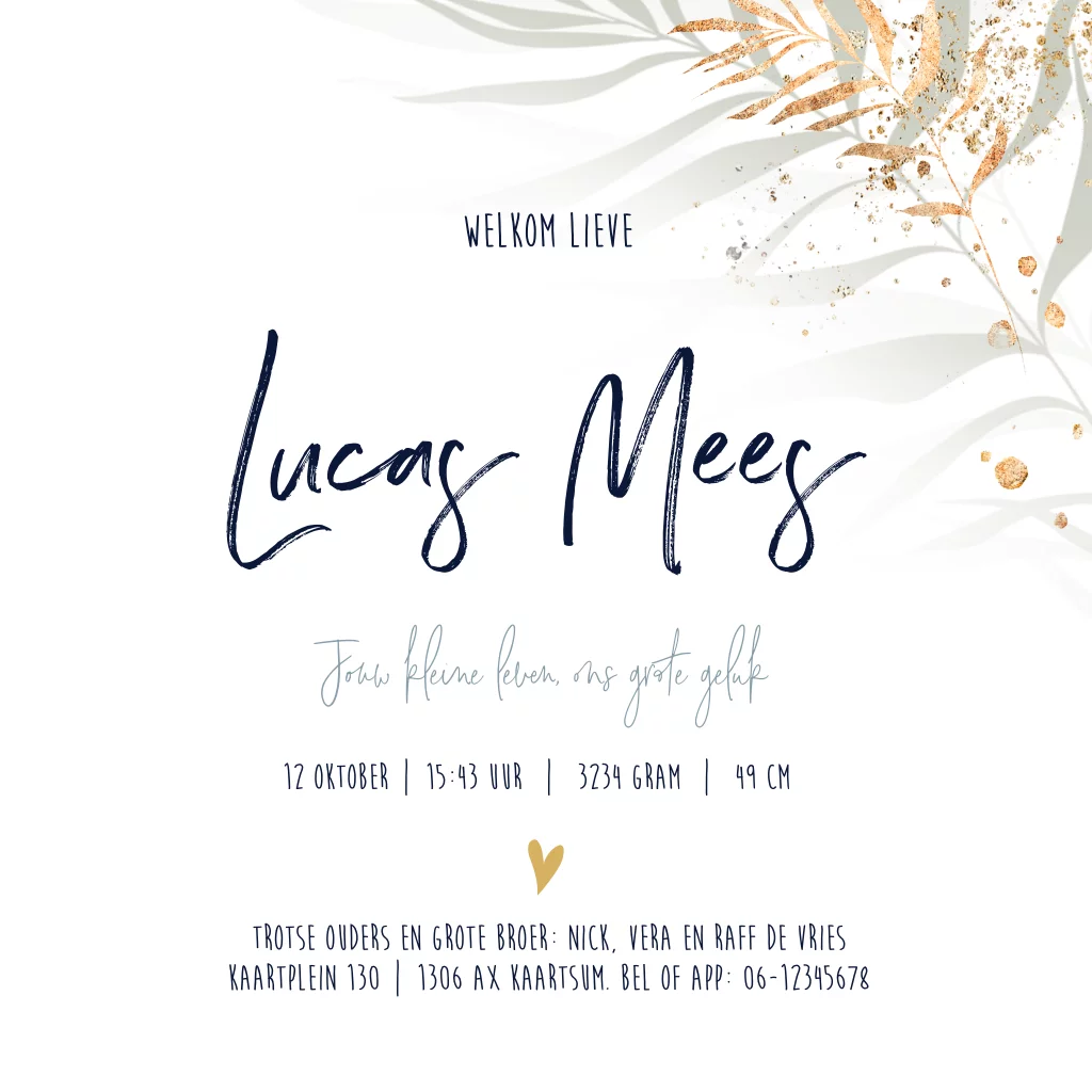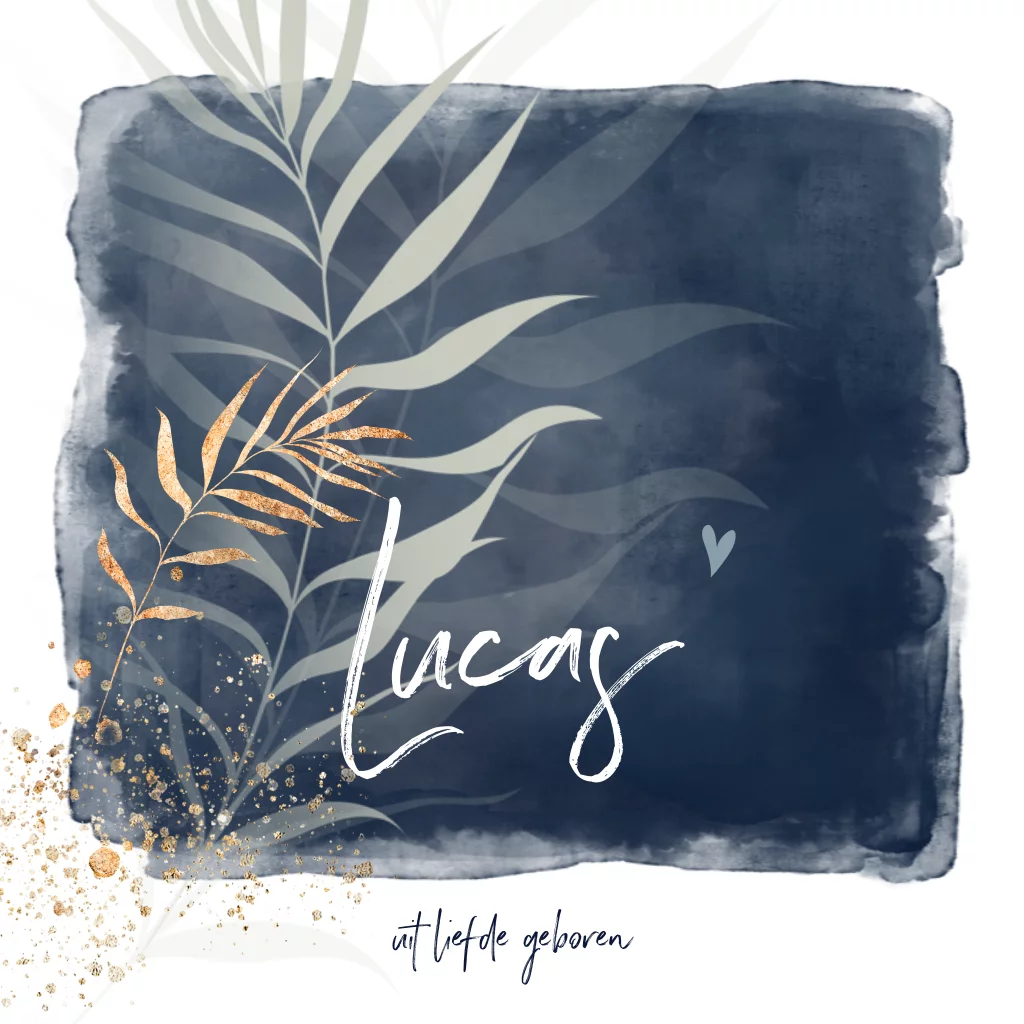 Een stoer geboortekaartje voor jullie zoontje. Het vierkante kaartje heeft een blauwe achtergrond met daarop bladeren in junglethema. Pas het ontwerp naar wens aan in onze online editor.