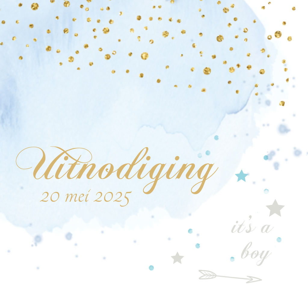 Lief kraamfeest kaartje voor een jongen met zachtblauwe aquarel. De goudlook confetti maakt deze geboortekaart extra feestelijk. Dit geboortekaartje maak je zelf helemaal naar wens. Bekijk hier het bijpassende geboortekaartje.
