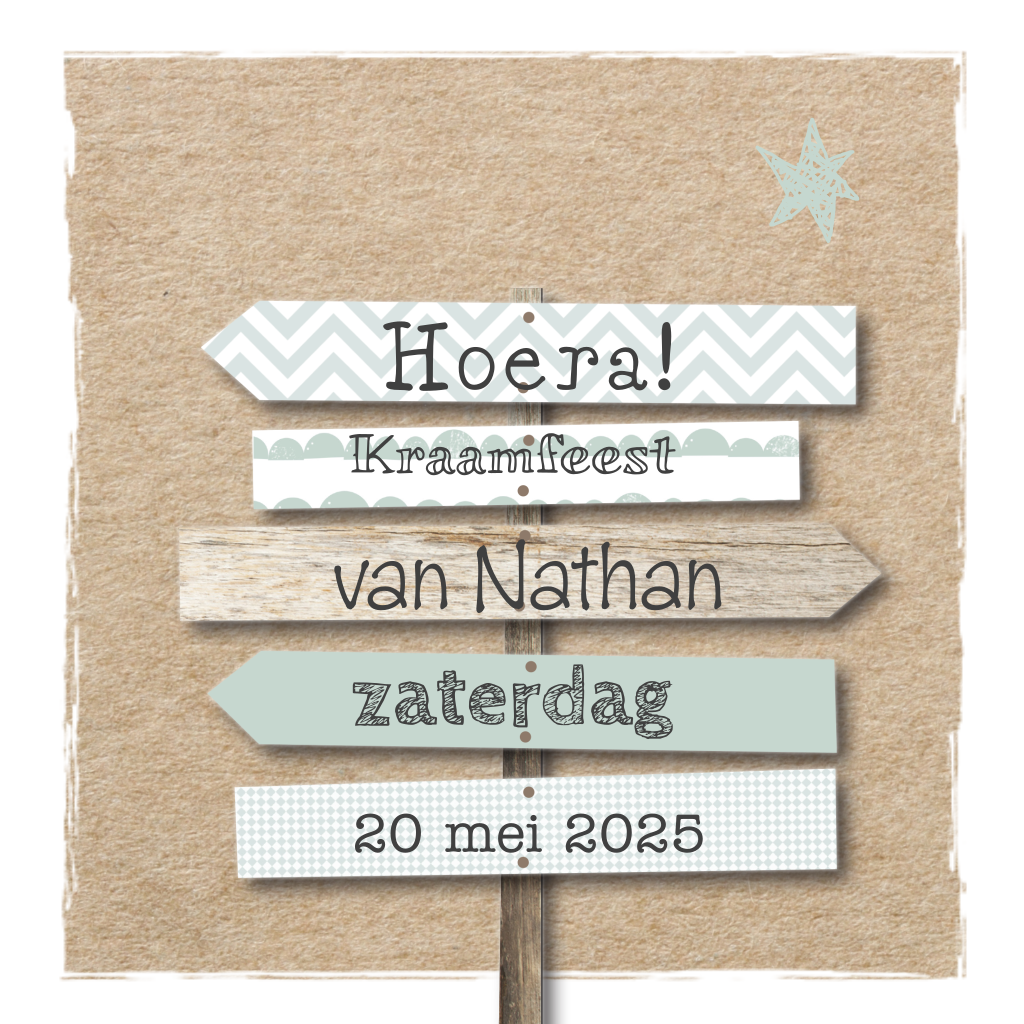 Mint groen kraamkaartje voor een jongen met kraft look en wit kader rondom. Houten wegwijs borden met hippe patronen en speelse sterren. Alles is aan te passen! Bekijk hier het bijpassende geboortekaartje.