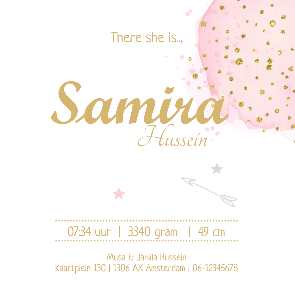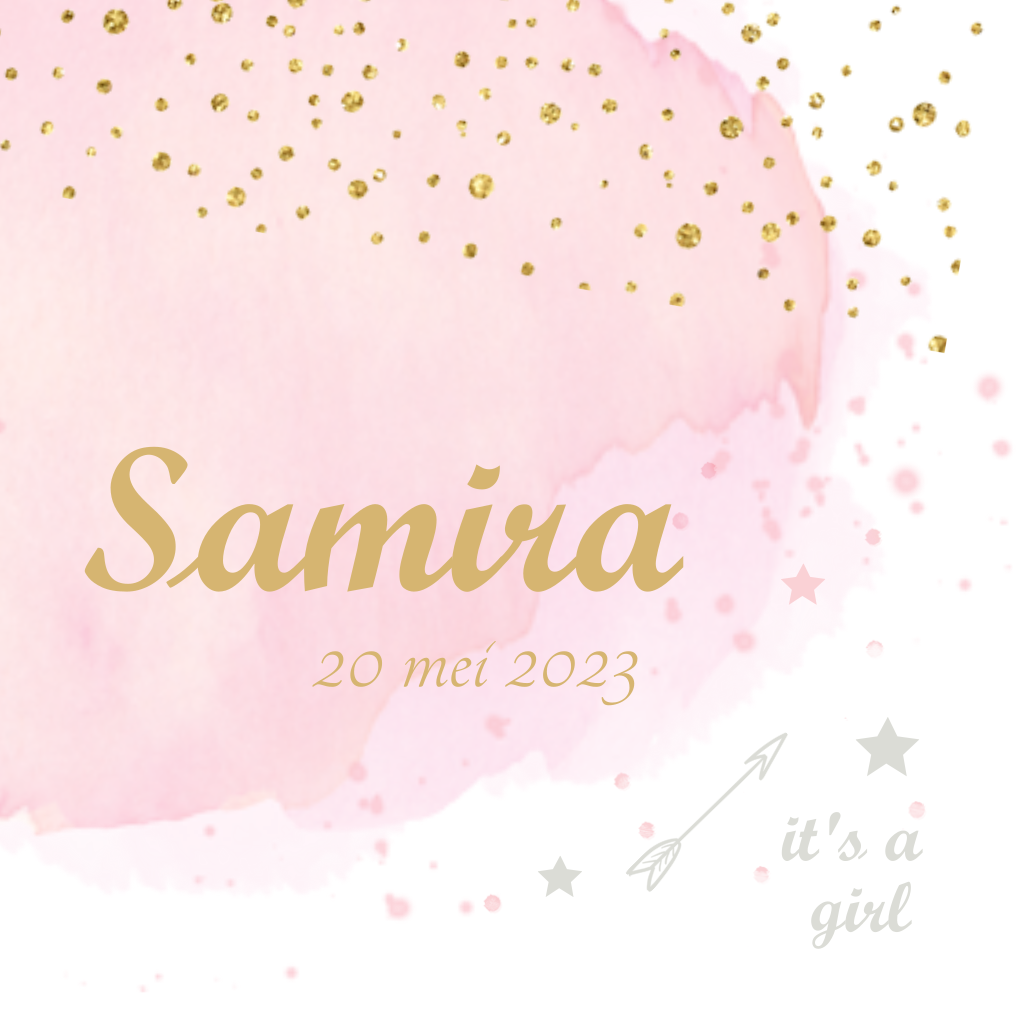 Hip Marokkaans geboortekaartje als geboorteaankondiging van je dochtertje. Met de roze aquarelverf is dit echt een lief kaartje! De grafische goudlook glitters zijn echt hip!