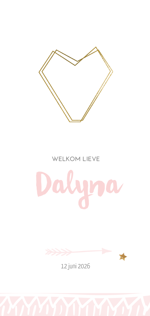 Een uniek langwerpig geboortekaartje voor een meisje. Met Scandinavische look en feel, ster en open lijn hart met goud look. In een modern roze tint die ook aangepast kan worden! Extra lang formaat 10x21cm.