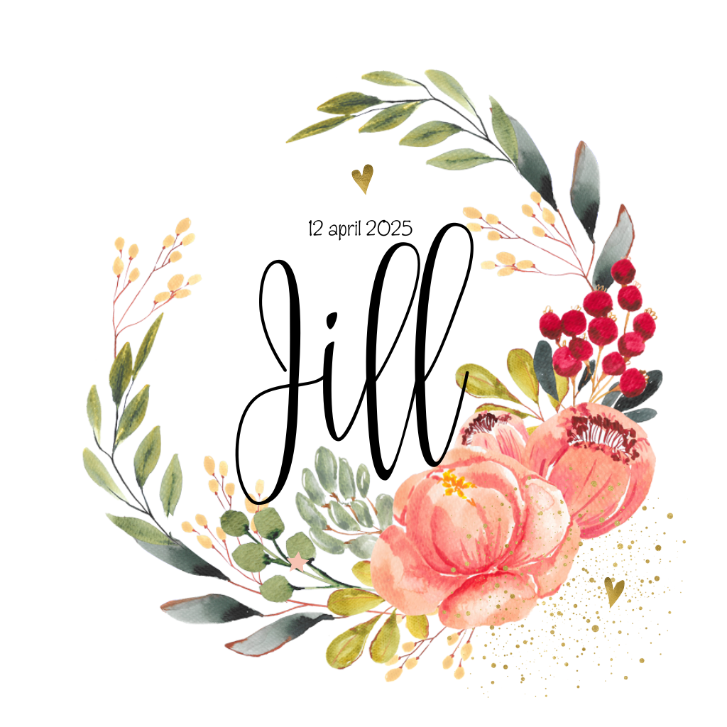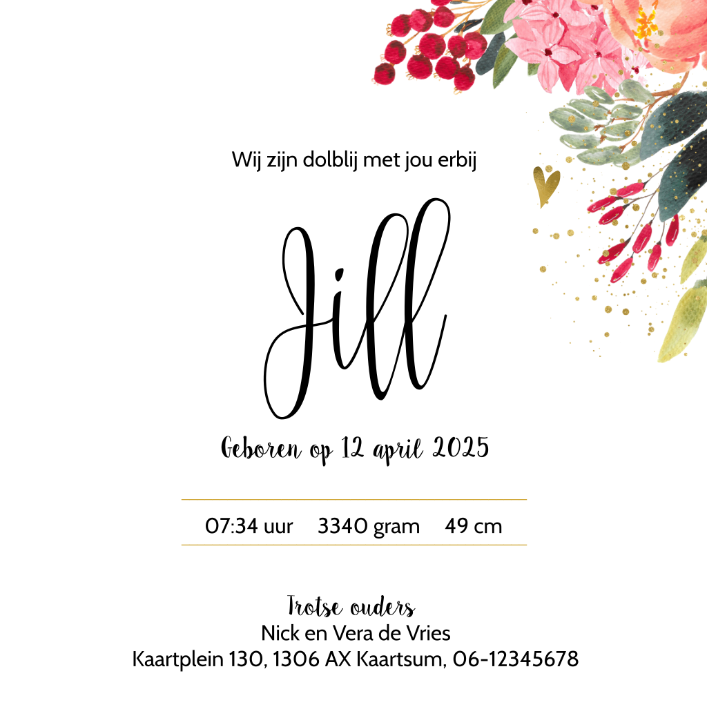 Sierlijk geboortekaartje met prachtige bloemen en verschillende plantjes. Het sierlijke lettertype combineert hier mooi bij. Ook leuk zijn de twee subtiele hartjes in goudlook en de stipjes eromheen. Voor een kleine dame!
